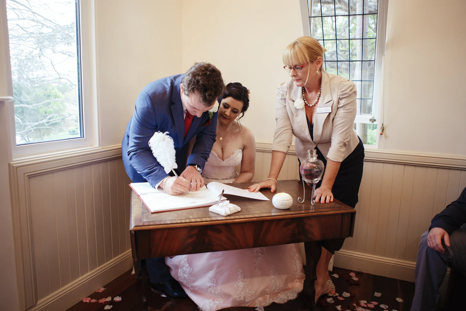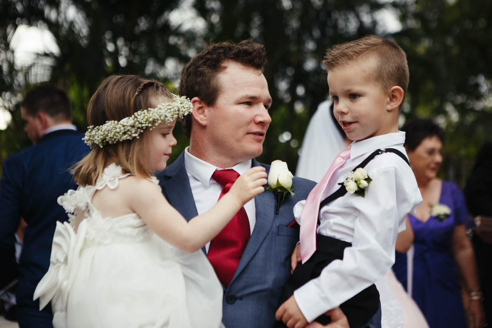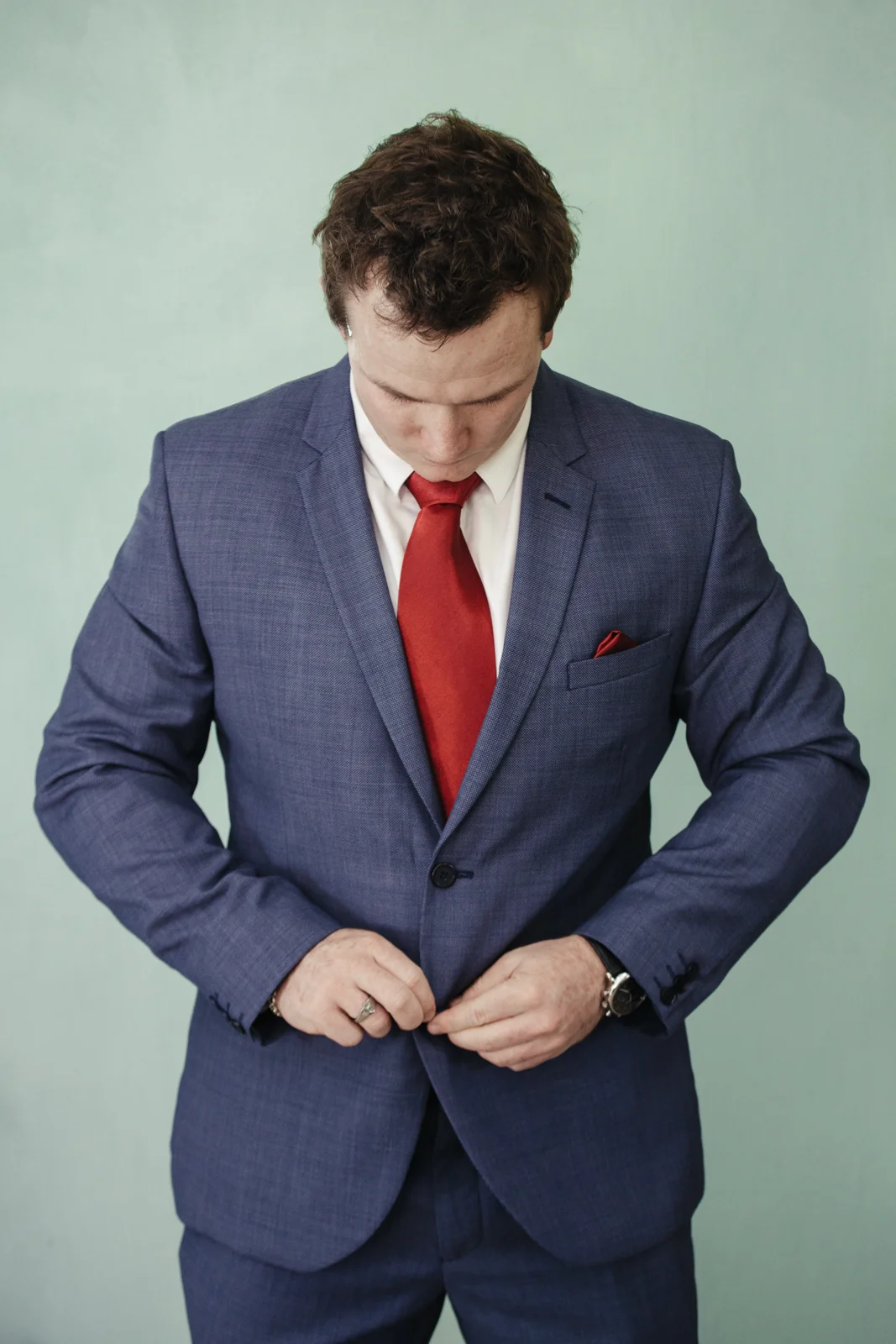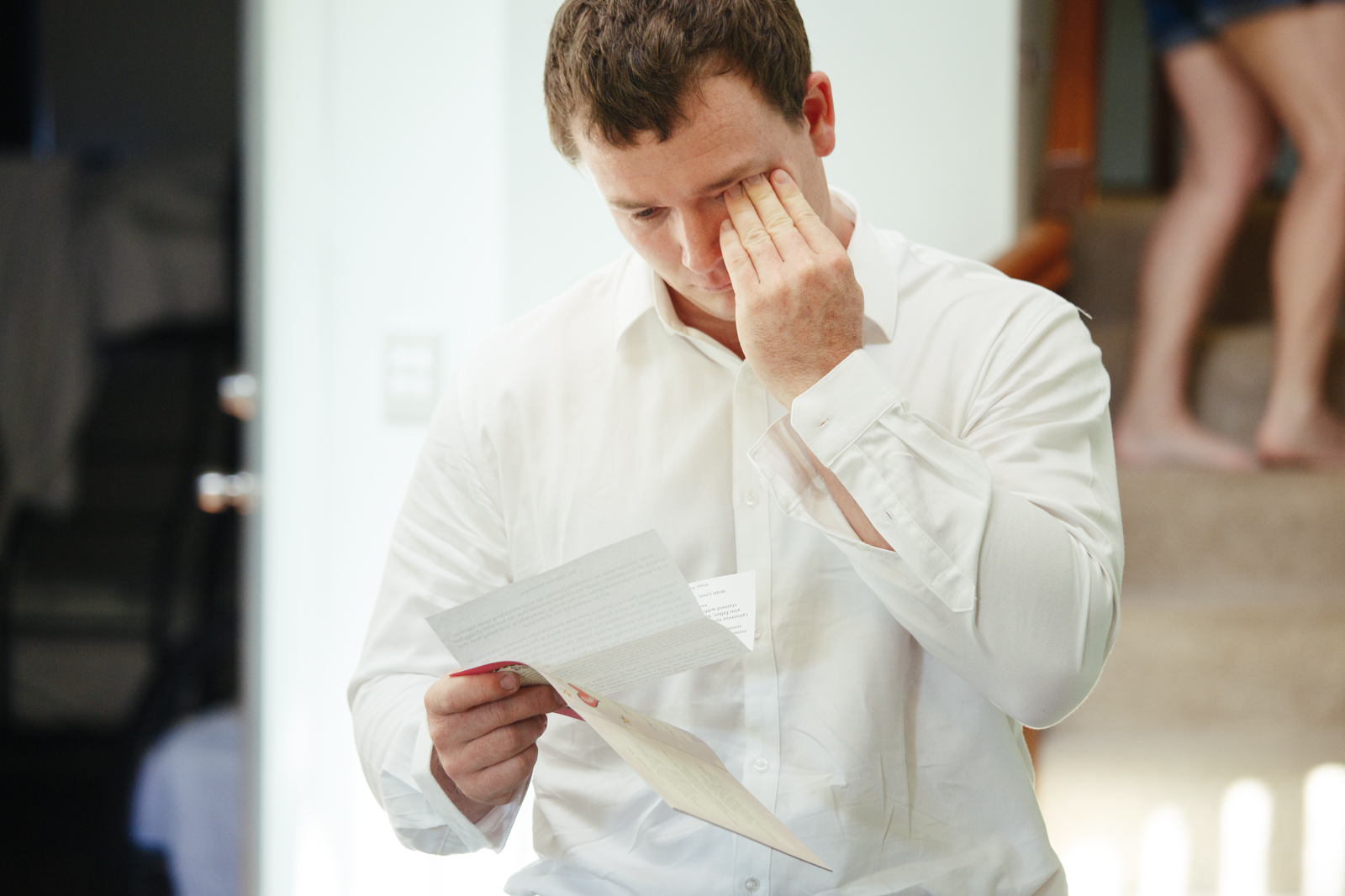 Before it was time to put on the assemble of clothes first Jenna had given Matthew an entourage of gifts accompanied with a letter. It was truly a beautiful moment, as Matthew claimed he wasn't even through the first paragraph before he started to wipe tears away from his eyes. What made the gifts even more personable was the little notes attached to each seperate gift she had given him for the day. From a pair of sunnies, to the expensive watch, Matthew was over joyed. Matthew adjourned his dark blue suit with a dark red tie and a matching hanky chief accompanying his look. Matthew had two of his groomsmen apart of his morning ritual, to which involved a selection of gifts and Matthews dad never failing to get a laugh or two from us.