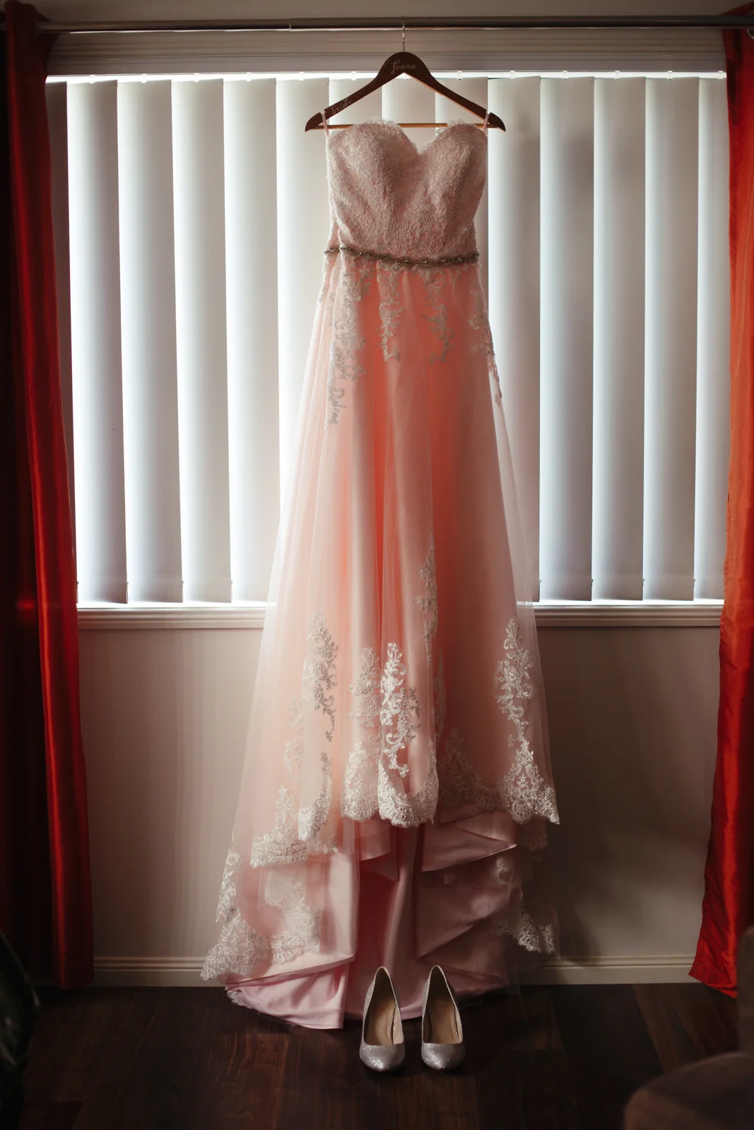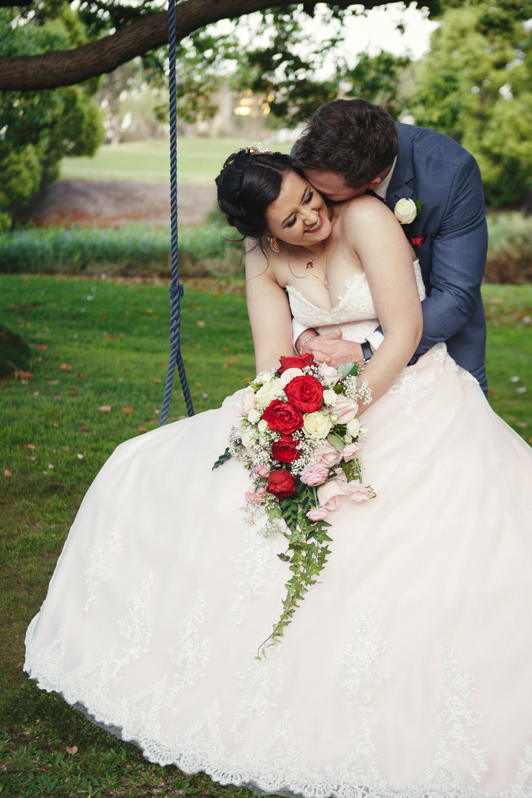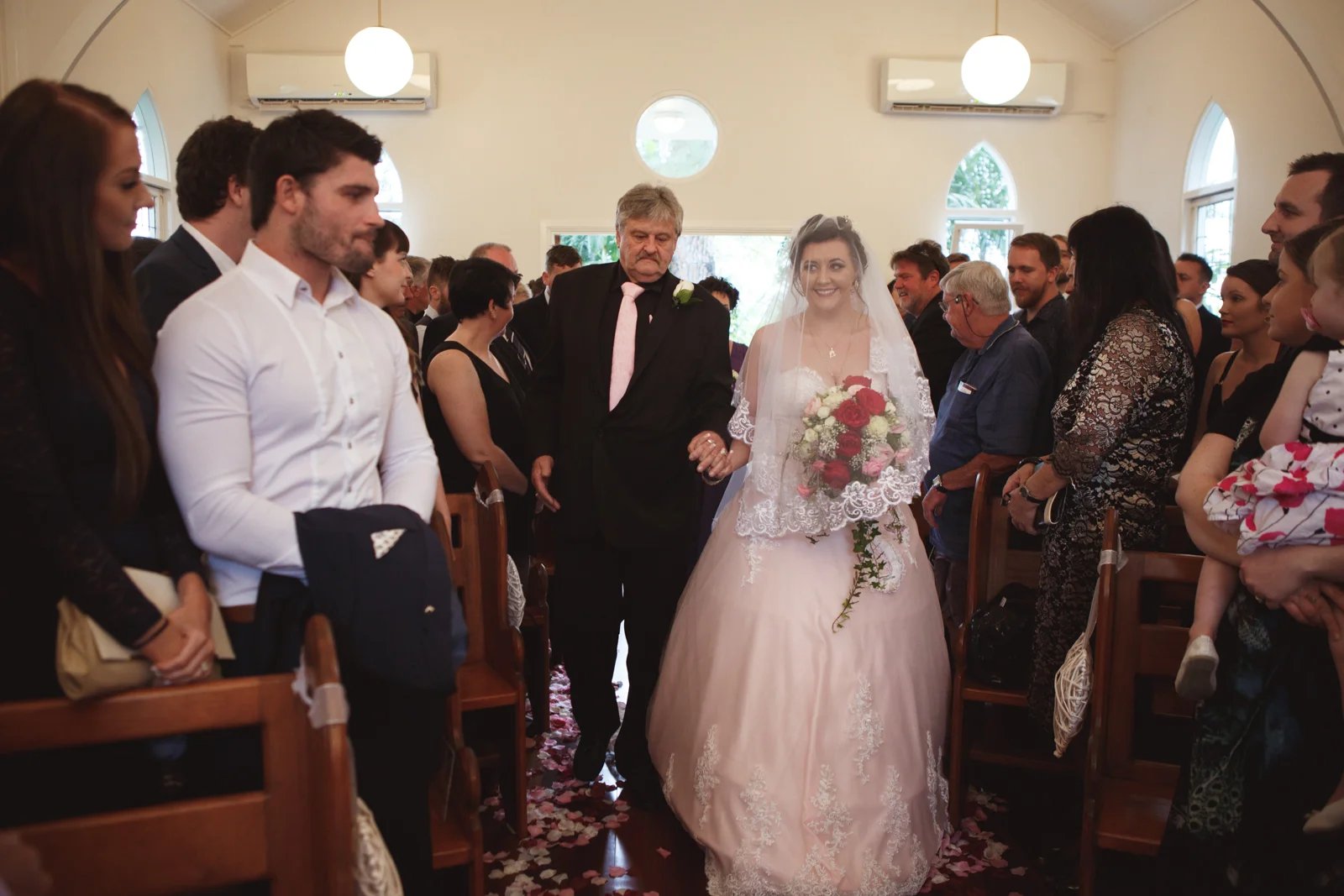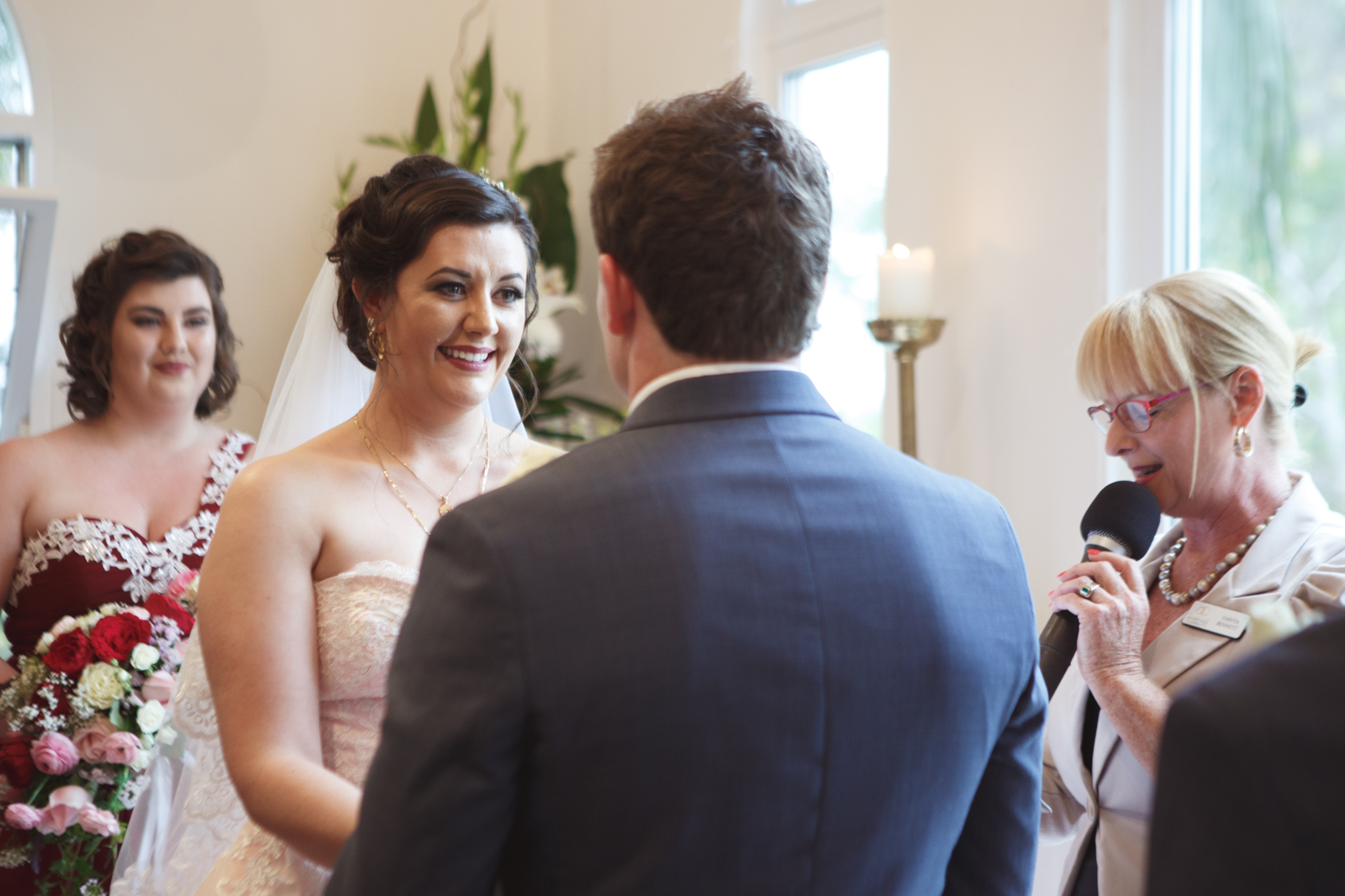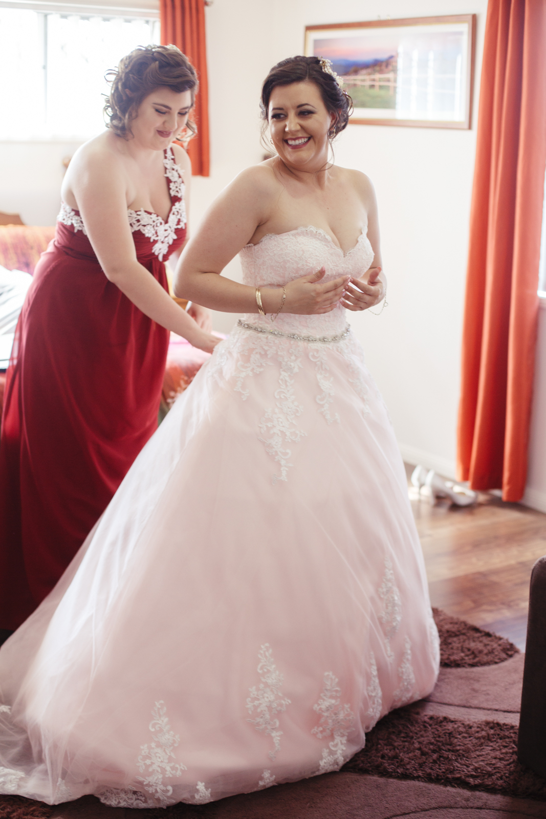 When one of our crew members turned up at Jenna's pre getting ready place, she had her two bridesmaids and mother surrounding her with a few laughs. With a deep dark red lipstick and a dress Jenna's mother made for her; the white lace meshed effortlessly with the pink undercoat to which we rarely see!! This sleeveless dress looked exquisite on Jenna with her hair done up and curled to the side, she truly looked like a dream. Accompanying her look was the two bridesmaids of her choosing who to which wore dark maroon floor length gowns with white trimming.