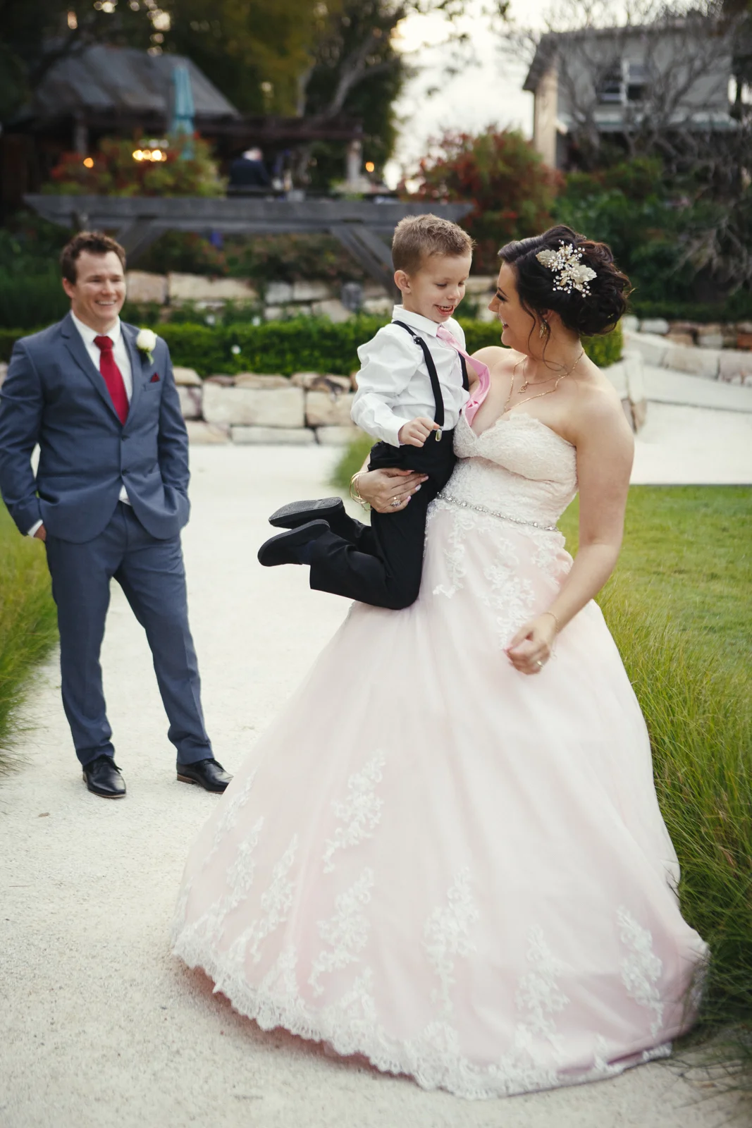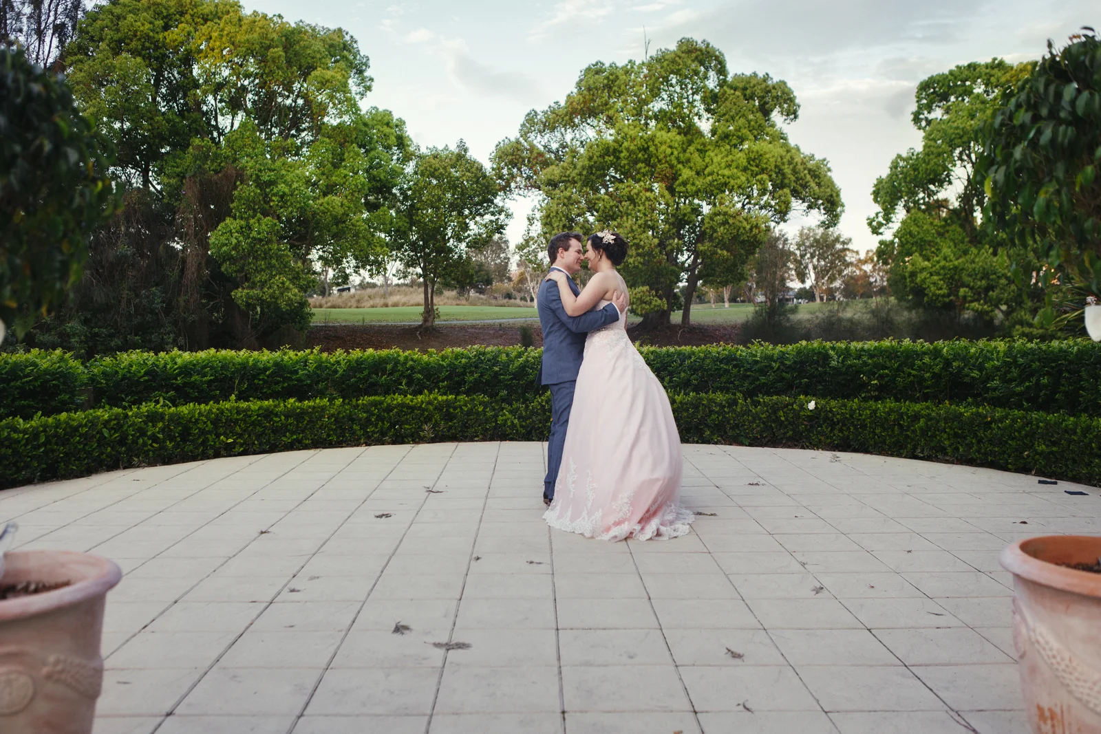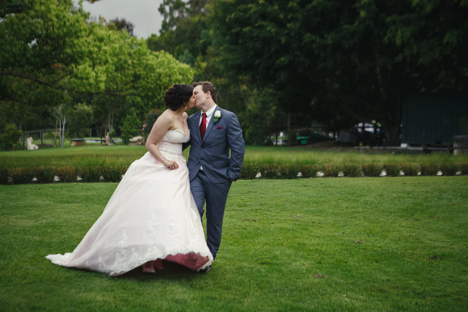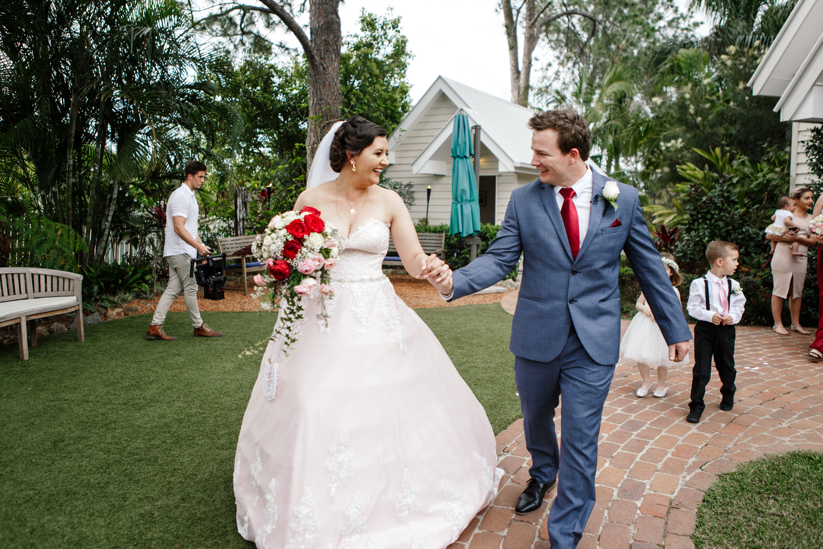 When one of our crew members turned up at Jenna's pre getting ready place, she had her two bridesmaids and mother surrounding her with a few laughs. With a deep dark red lipstick and a dress Jenna's mother made for her; the white lace meshed effortlessly with the pink undercoat to which we rarely see!! This sleeveless dress looked exquisite on Jenna with her hair done up and curled to the side, she truly looked like a dream. Accompanying her look was the two bridesmaids of her choosing who to which wore dark maroon floor length gowns with white trimming.