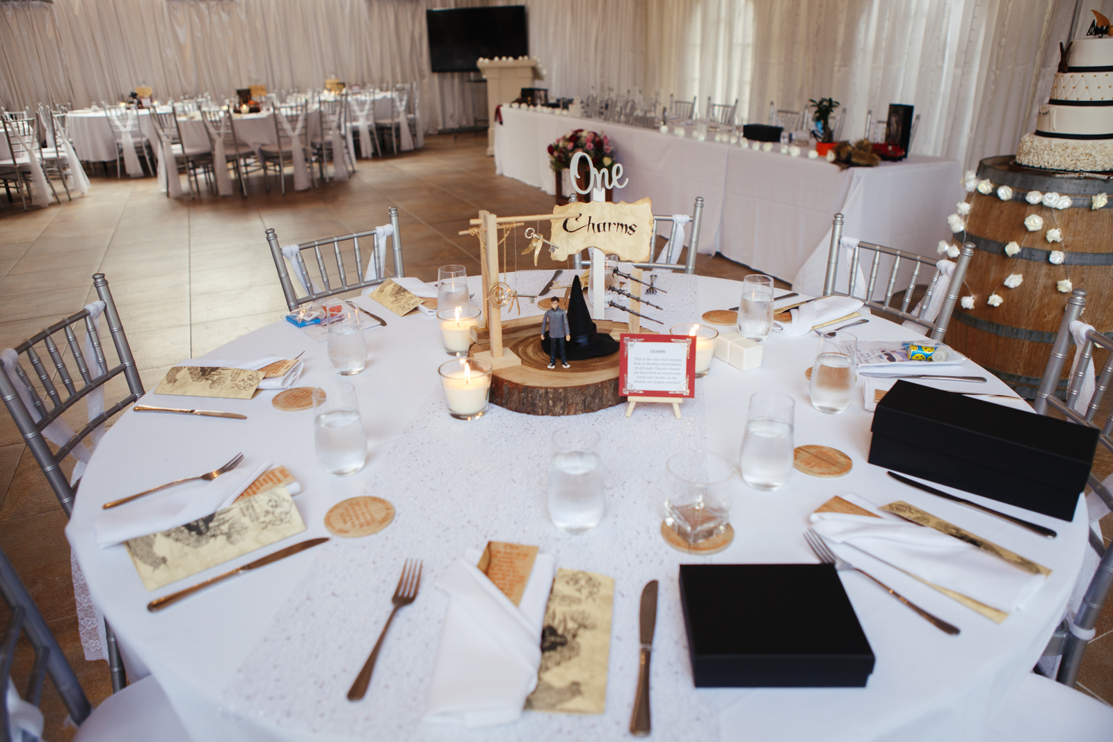 One of the massive surprises that contributed to the day, was the extreme hard work Jenna's parents put into surprising her for the reception of the year!! Yes it WAS Harry Potter themed. Starting from the very doorway, their was a quirky sign with each guest needing to look at the the houses and table/classes they were to be assigned to. With each table having it's own class and small trinkets centred around the middle, what made the gesture even more sentimental was the hard work Jenna's father put into carving the centre pieces around all of the reception tables.