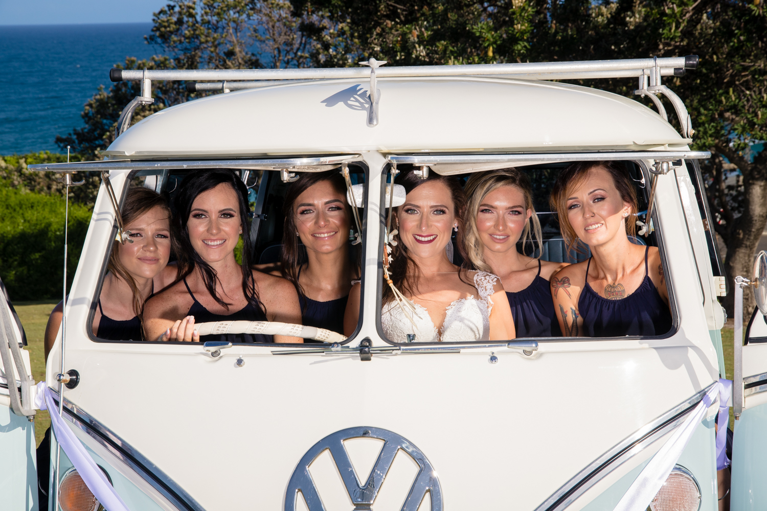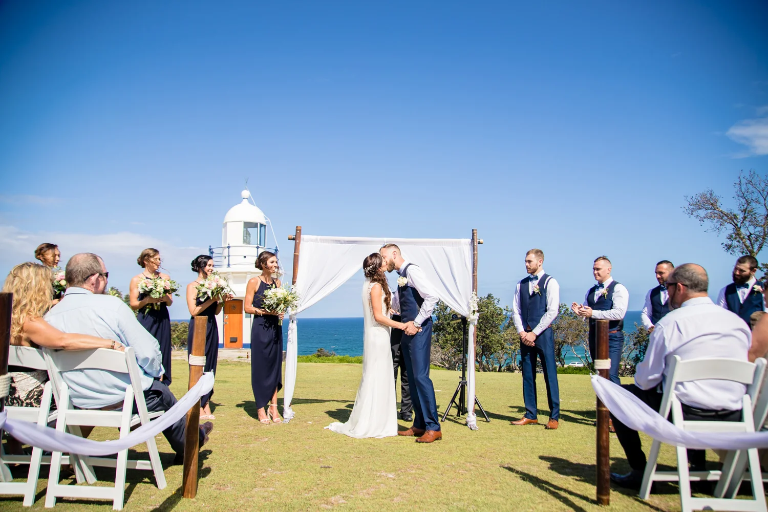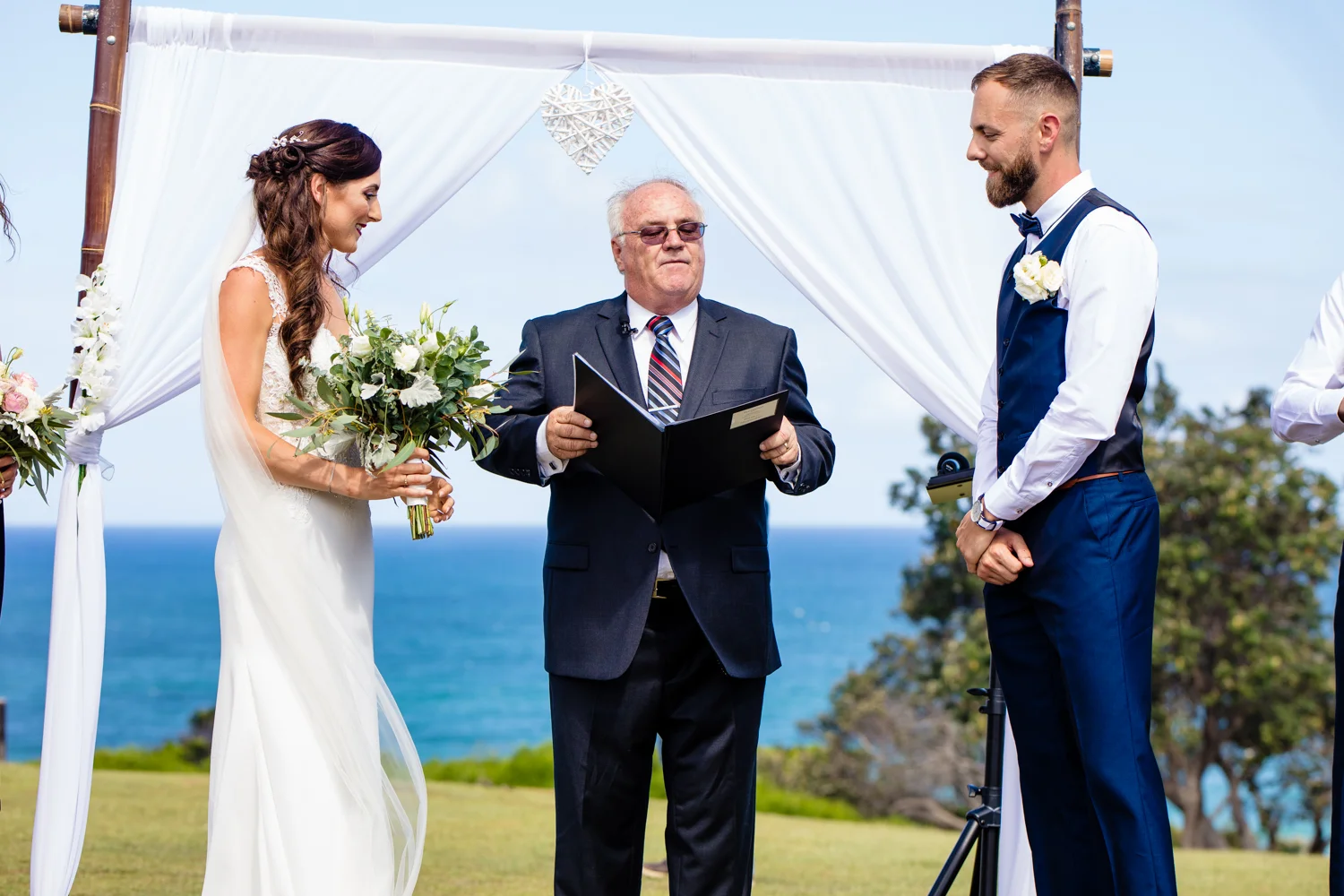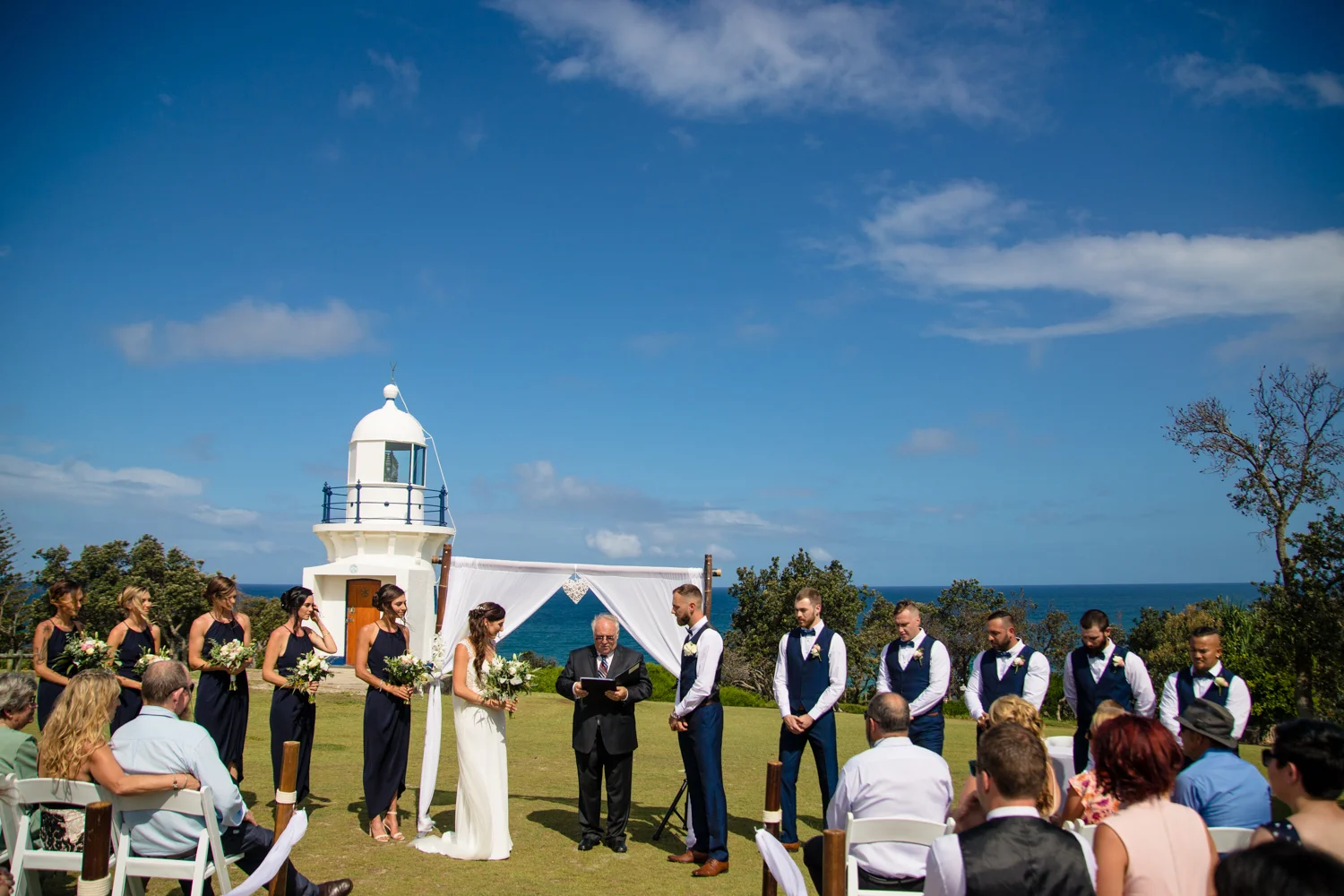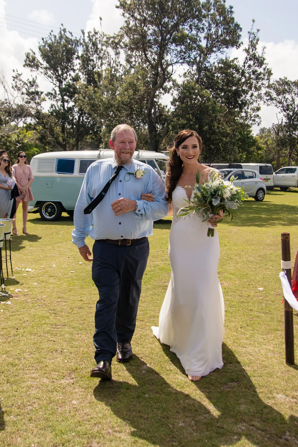 It wasn’t long before we were off to the ceremony at Ballina lighthouse. Such a great ceremony location for an outdoor wedding, with the scenery of the beach to overlook at as you’re saying your vows, with the arbour being entered down the middle of the aisle, and white chairs for the guests, we went into action mode, setting up all the tripods and key audio gear, before it was time for Tahni start her newlyweds journey. Turning up in kombi limo, a day surely now to be remembered with the luxurious dreamy cream & white Kombi experience. With Dean standing at the centre of the aisle next to their celebrant phil chapman, it was a cute ceremony, that had conjured up a few tears and laughs also from the crowd.