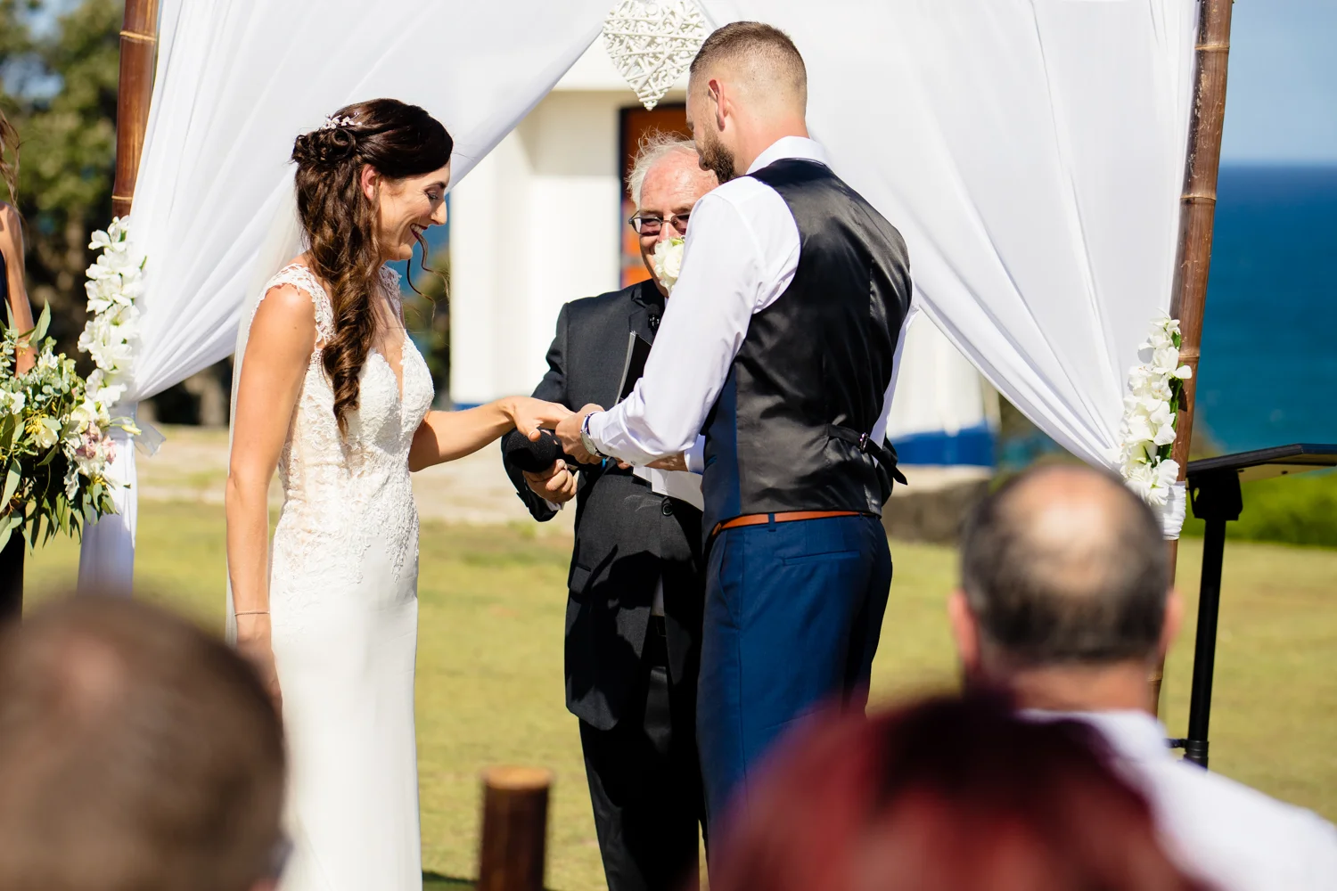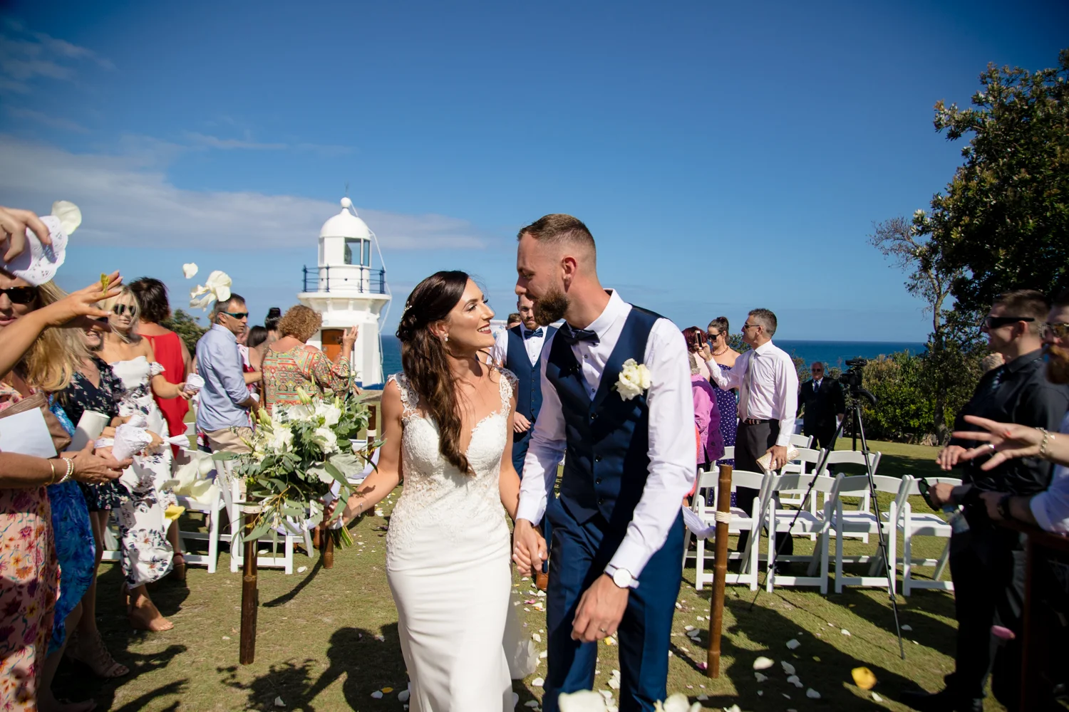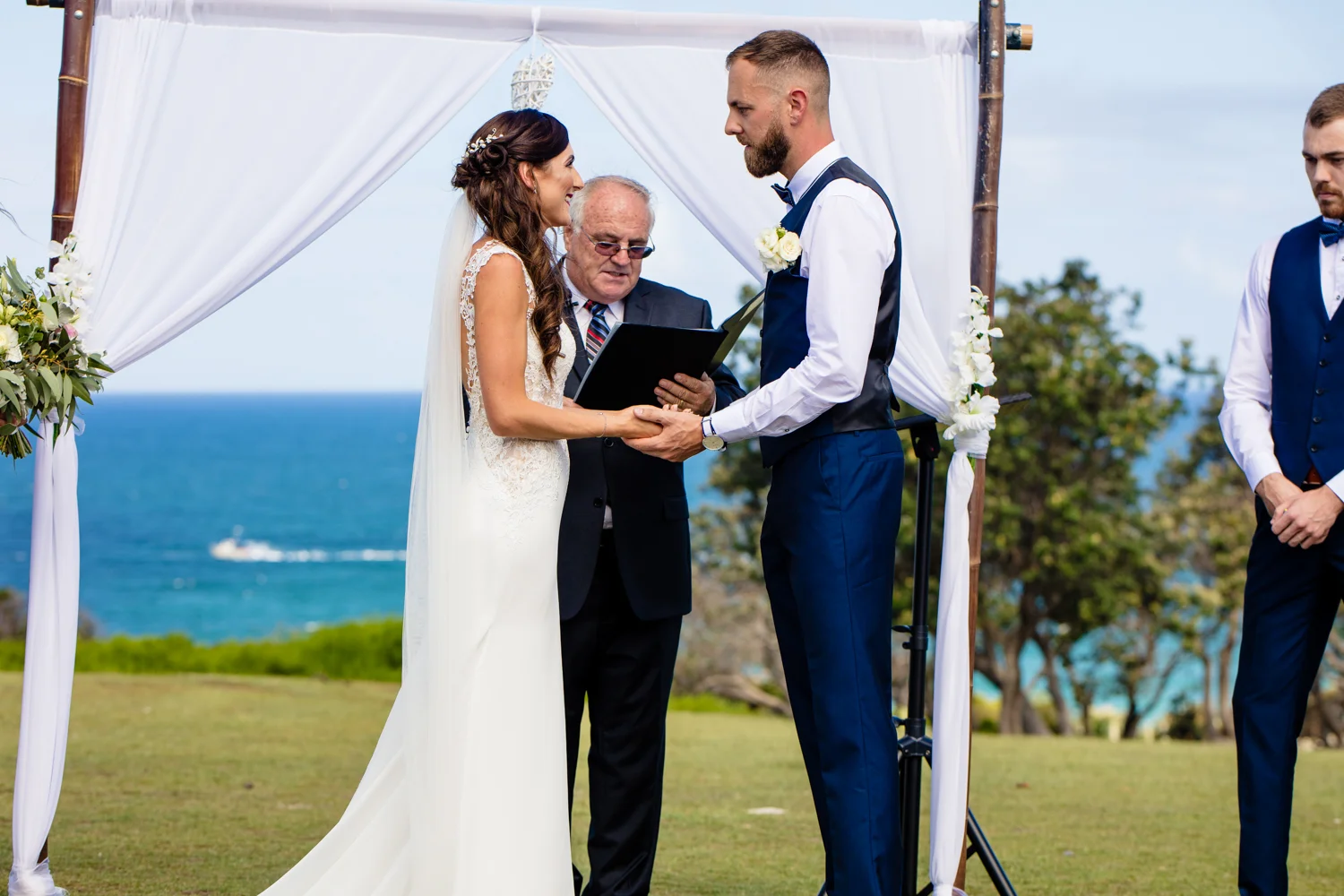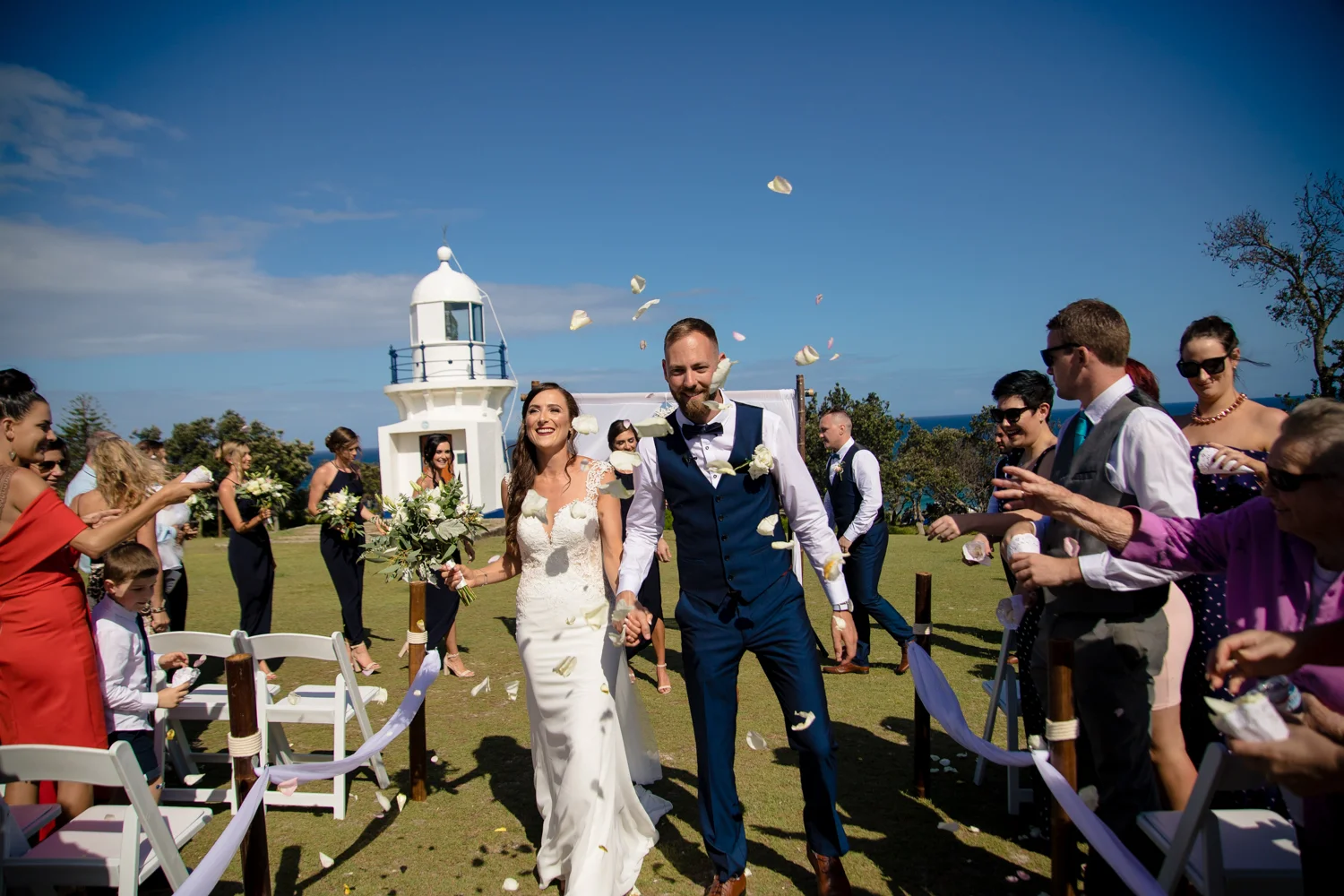 It wasn’t long before we were off to the ceremony at Ballina lighthouse. Such a great ceremony location for an outdoor wedding, with the scenery of the beach to overlook at as you’re saying your vows, with the arbour being entered down the middle of the aisle, and white chairs for the guests, we went into action mode, setting up all the tripods and key audio gear, before it was time for Tahni start her newlyweds journey. Turning up in kombi limo, a day surely now to be remembered with the luxurious dreamy cream & white Kombi experience. With Dean standing at the centre of the aisle next to their celebrant phil chapman, it was a cute ceremony, that had conjured up a few tears and laughs also from the crowd.