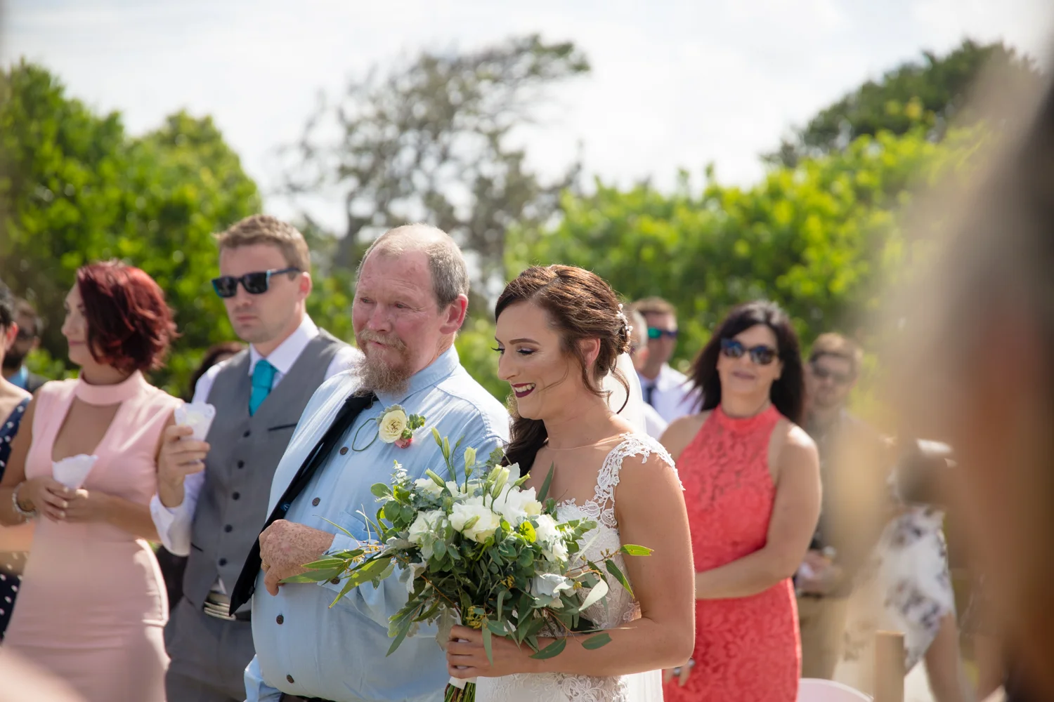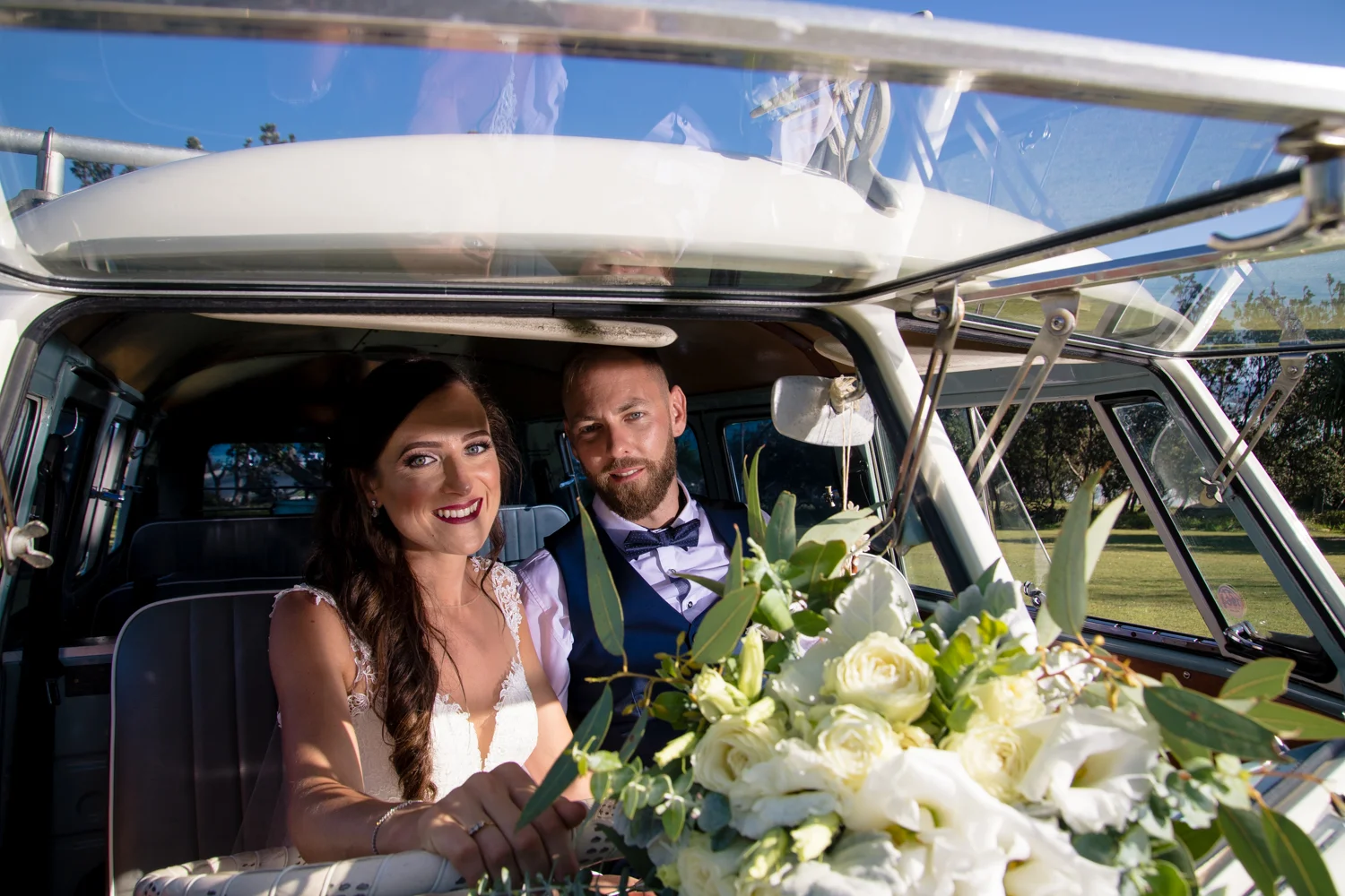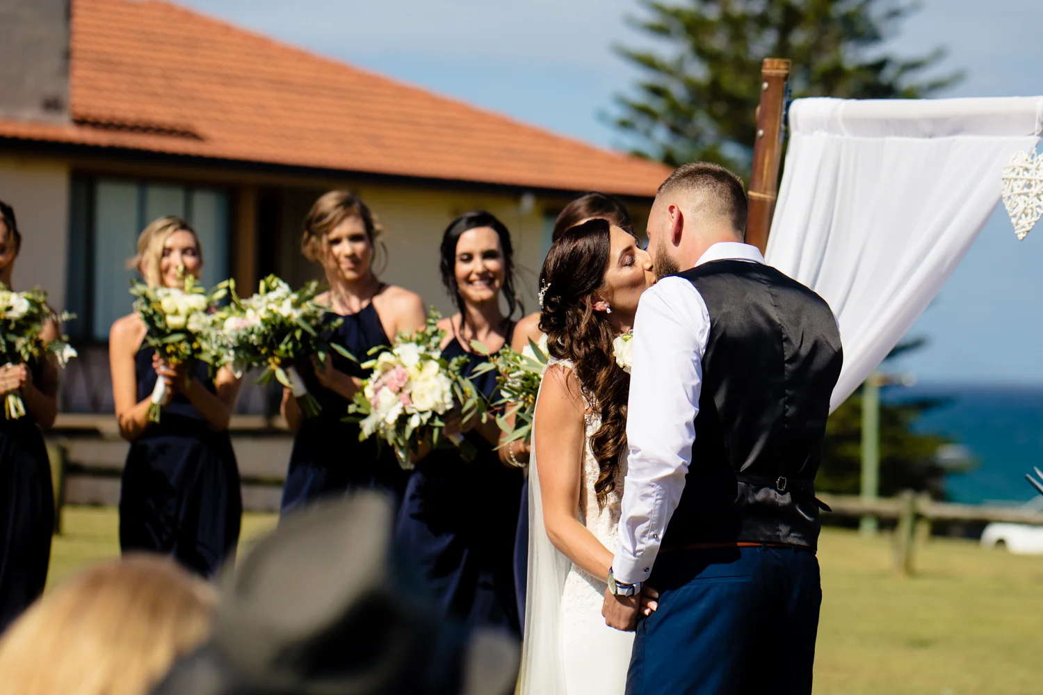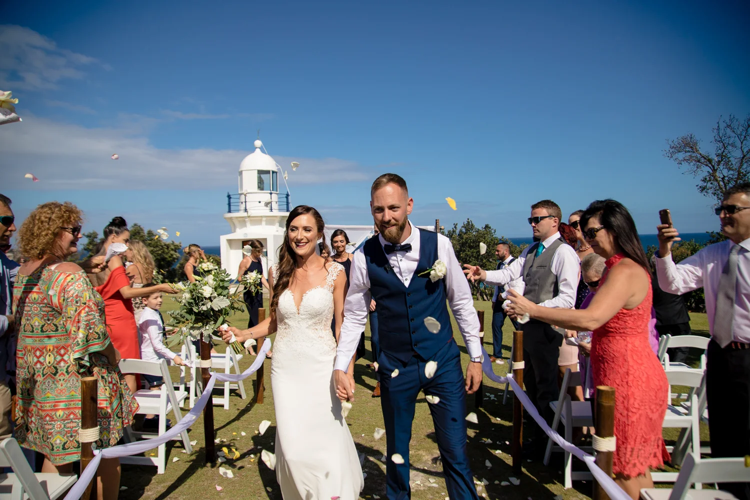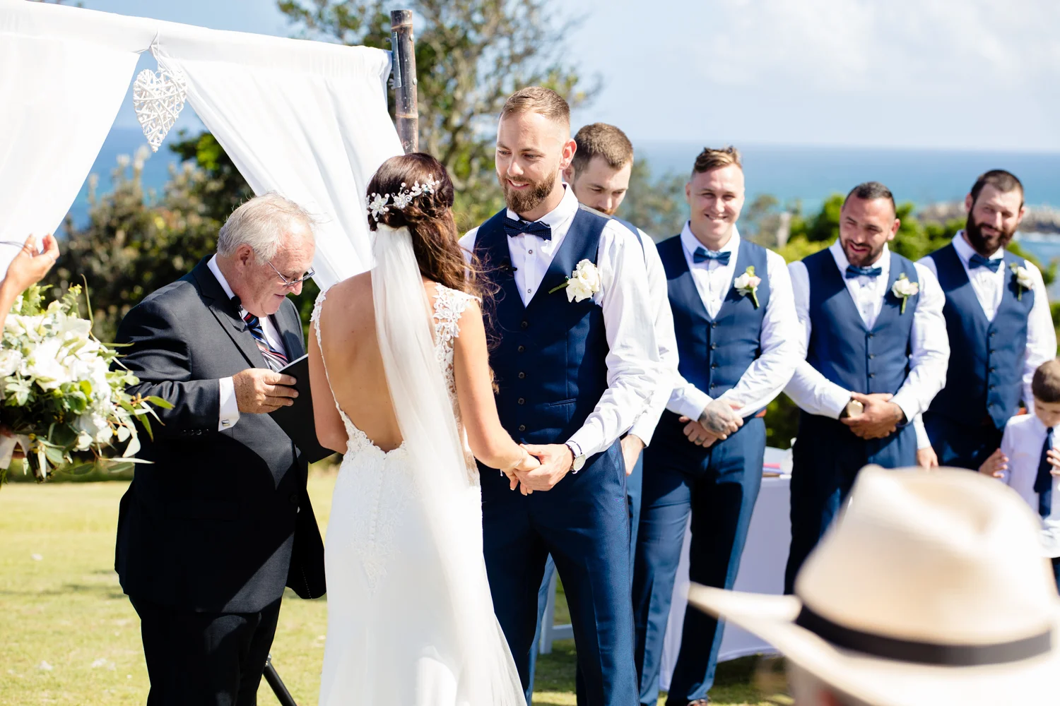 It wasn’t long before we were off to the ceremony at Ballina lighthouse. Such a great ceremony location for an outdoor wedding, with the scenery of the beach to overlook at as you’re saying your vows, with the arbour being entered down the middle of the aisle, and white chairs for the guests, we went into action mode, setting up all the tripods and key audio gear, before it was time for Tahni start her newlyweds journey. Turning up in kombi limo, a day surely now to be remembered with the luxurious dreamy cream & white Kombi experience. With Dean standing at the centre of the aisle next to their celebrant phil chapman, it was a cute ceremony, that had conjured up a few tears and laughs also from the crowd.