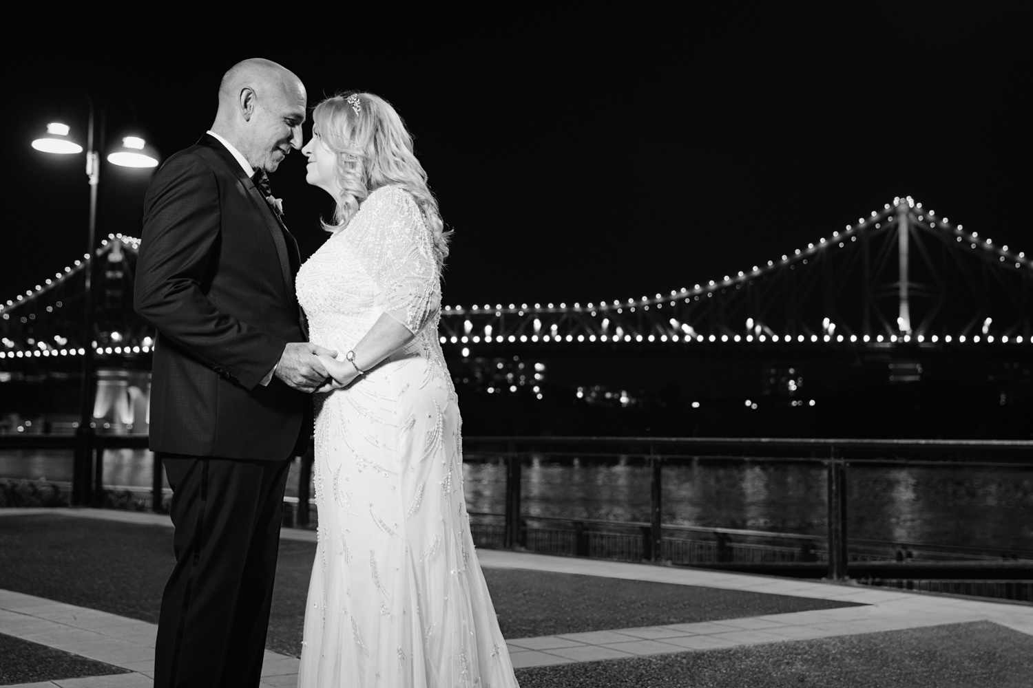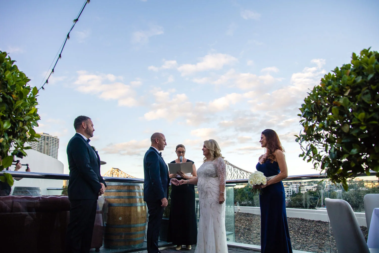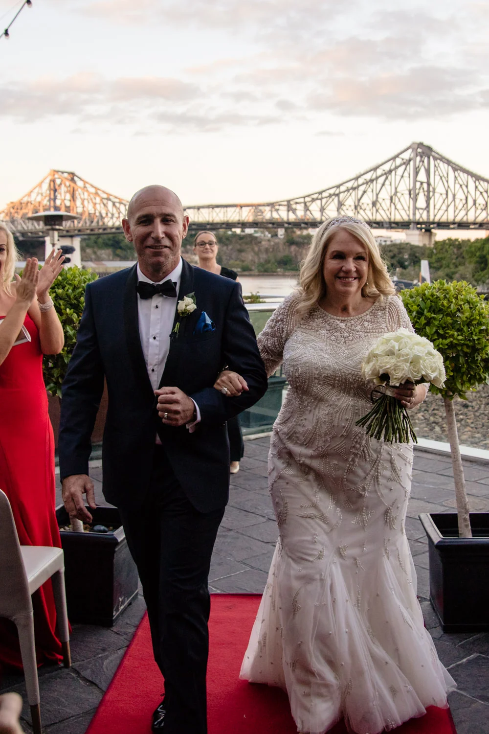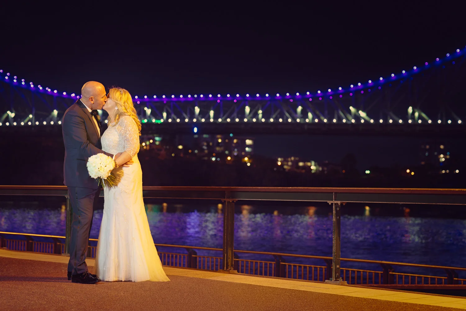 The ceremony continued to move along smoothly, as heartfelt words were spoken and two became one, it was nothing short of the perfect moment for both Michel & Jo. Walking back down the isle as husband & wife it was time to get started on the photos section. Starting it off with a huge group photo then heading down to Custom’s House this made for some AMAZING images, with the detailed building in the background it was just magnificent. Making our way over to the balcony overlooking the Brisbane river we were very pleased with all the moments captured. Doing a little more exploring we were beside the Brisbane river with the beautiful Story Bridge filling the background with its colourful lights, this made for some more spectacular images.