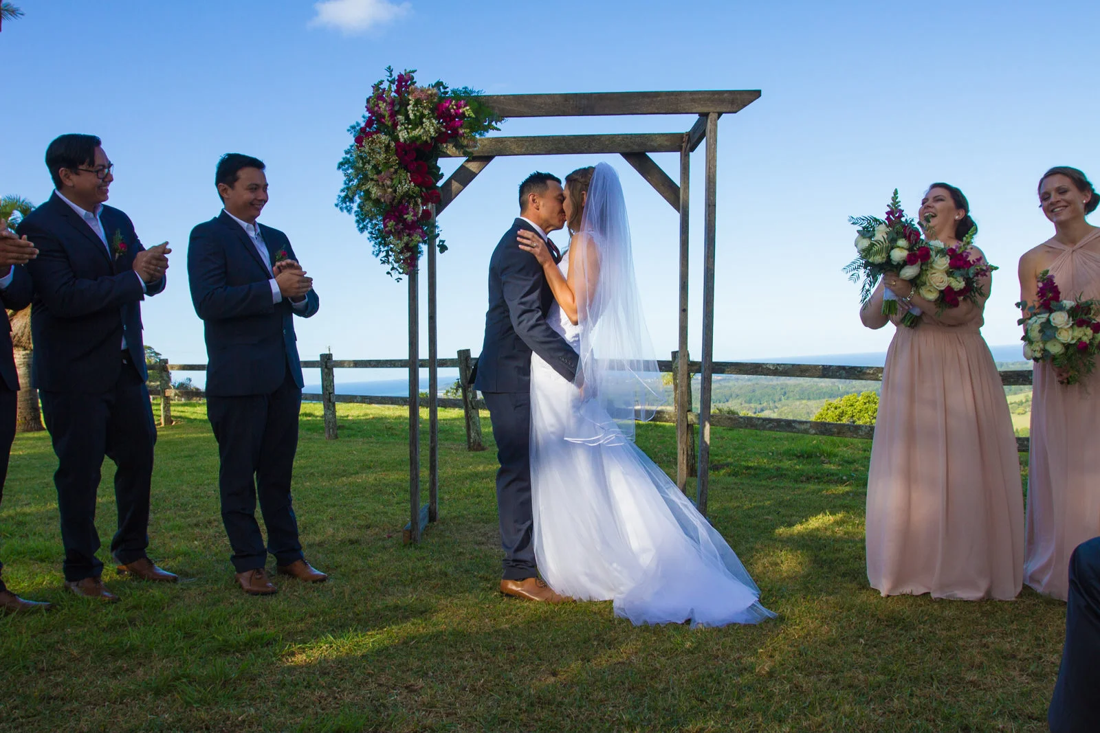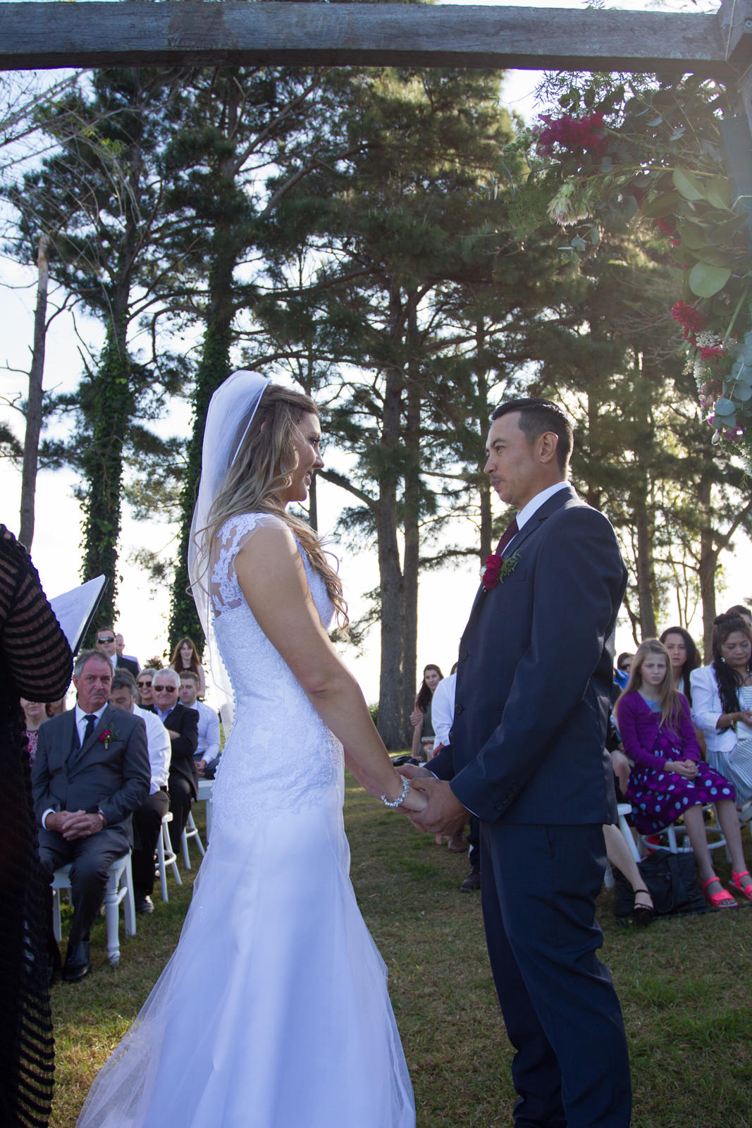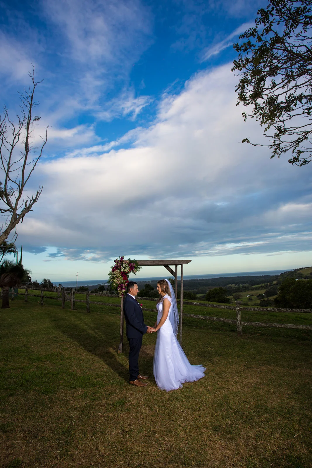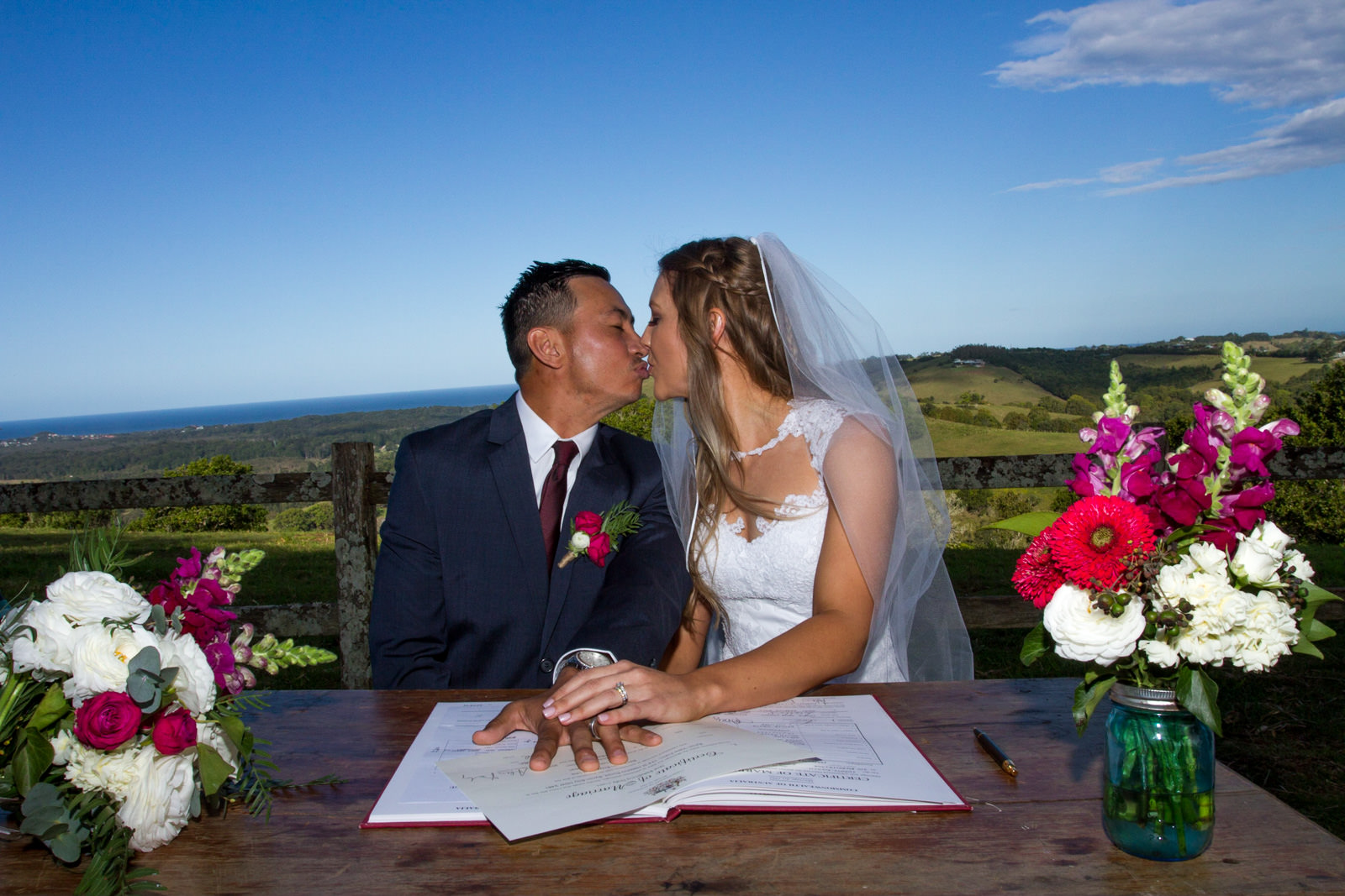 Byron View Farm really is a beautiful venue and we would love to shoot more weddings at this amazing venue seeing Benji waiting at the end of the alter while Angela and her father walked through the gate with the hills in the background and the fresh open air making for a beautiful atmosphere. First tears the laughter and smiles all round before a kiss a cheer and a quick signing of the paperwork before they walked back down the isle and into the rest of there wedding day adventure.
