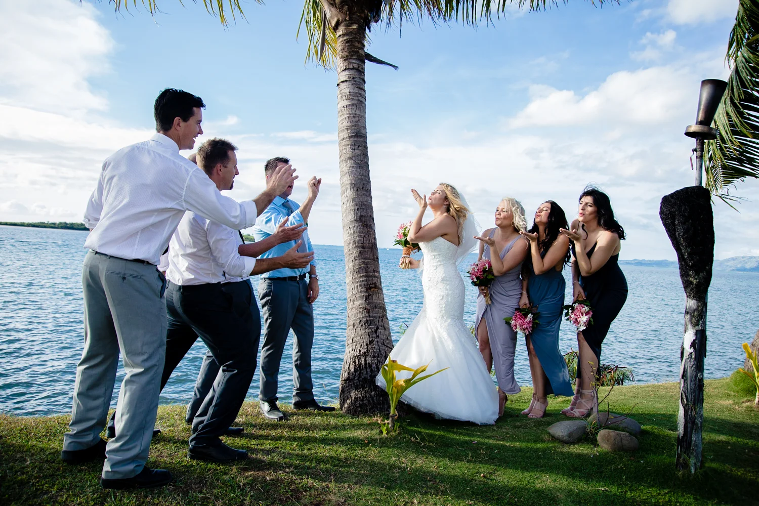 Waking up nice & early we made our way back to the Sheraton to meet our stunning bridal party. Spending the morning by the pool, on the beach and everywhere in between we all had a ball. The girls all had specially made swimsuits with ‘Bride’ & ‘Bridesmaids’ written across the front which was just an AWESOME idea! Especially being in Fiji it seemed the perfect idea. The boys came down not long after in their matching board-shorts & off we went to get some shots of the boys together creating memories together they would cherish forever.