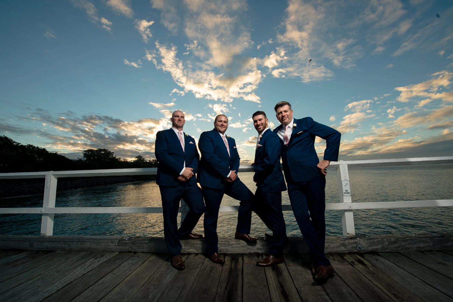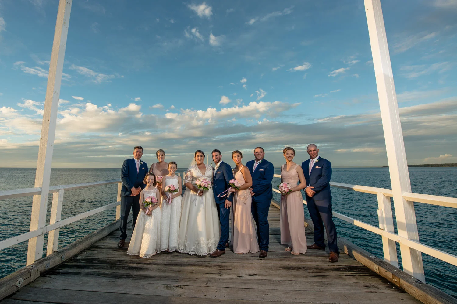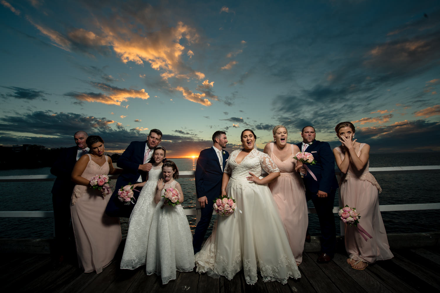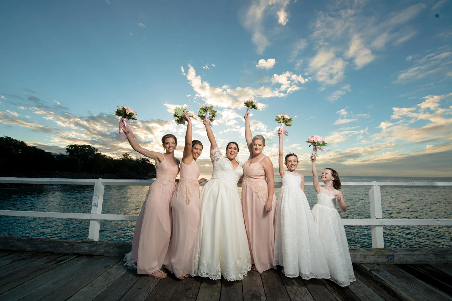 Getting the bridal party into the van we headed off to our first location, the Hervey Bay Botanical gardens. Which might I just add were beautiful!! Usually shooting at the gold coast botanical gardens it was a lovely change of scenery for us. Shortly after it was time to head down to the peer, full of people we managed to get some great shots of the group as the sun was setting behind them. Even a few funny shots of Ian & Lauren fishing off the peer together, we love images like this. Creating something unique for both the bride & groom to remember & look back on, making life long memories together already.