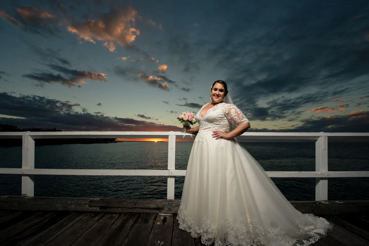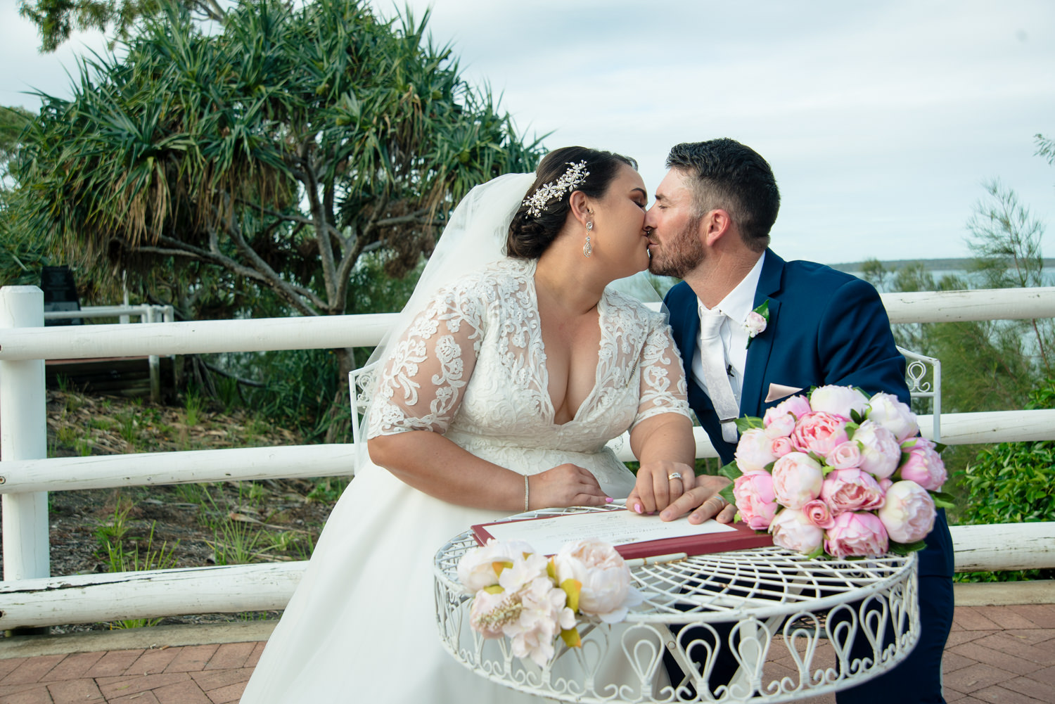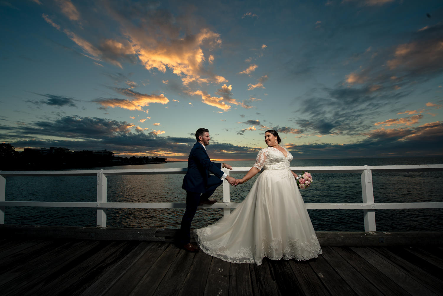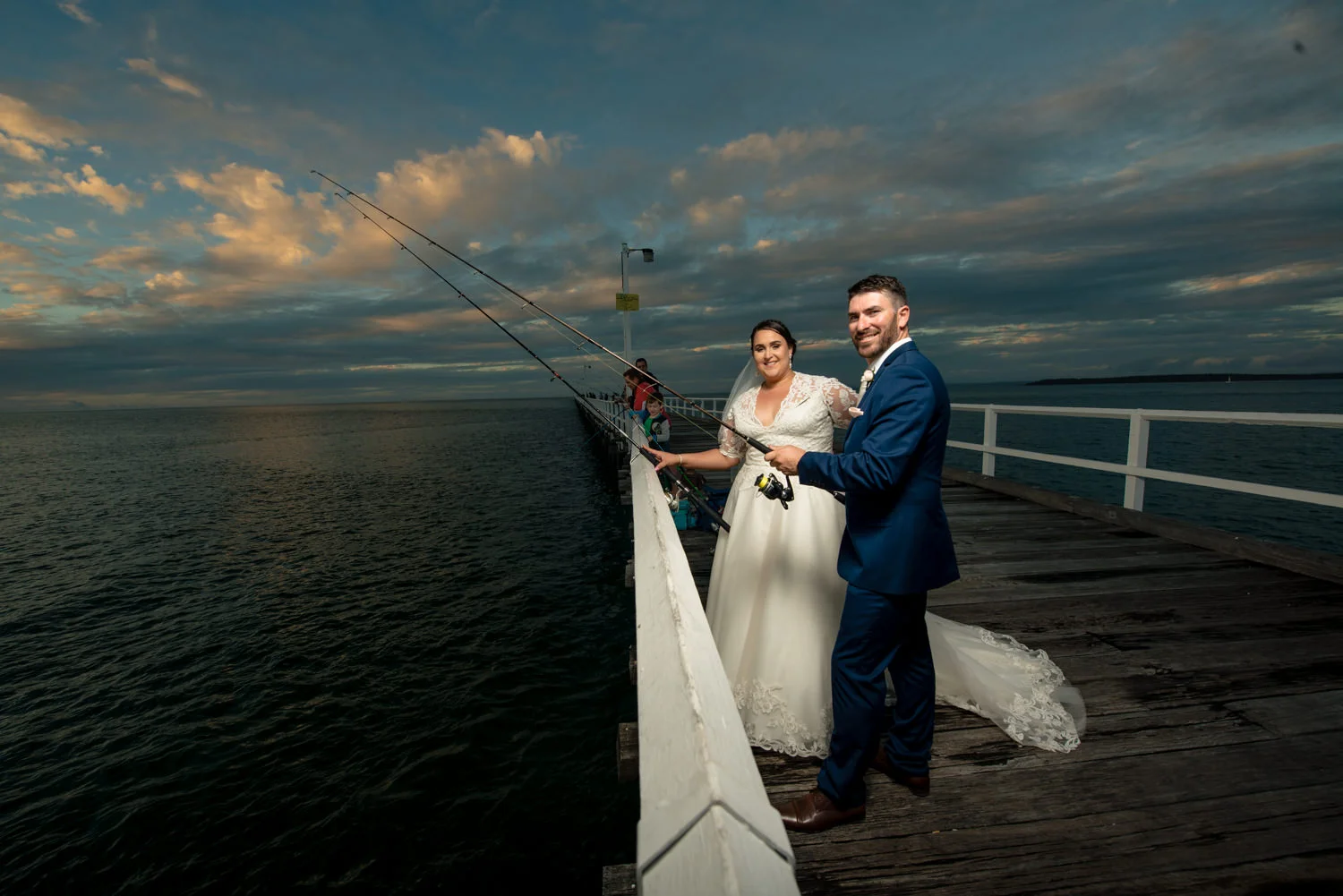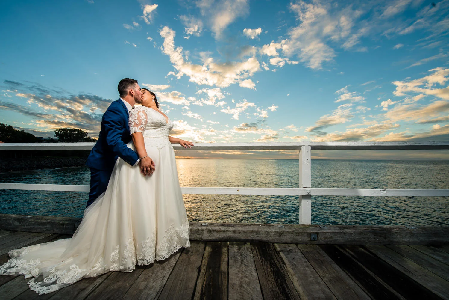 Getting the bridal party into the van we headed off to our first location, the Hervey Bay Botanical gardens. Which might I just add were beautiful!! Usually shooting at the gold coast botanical gardens it was a lovely change of scenery for us. Shortly after it was time to head down to the peer, full of people we managed to get some great shots of the group as the sun was setting behind them. Even a few funny shots of Ian & Lauren fishing off the peer together, we love images like this. Creating something unique for both the bride & groom to remember & look back on, making life long memories together already.