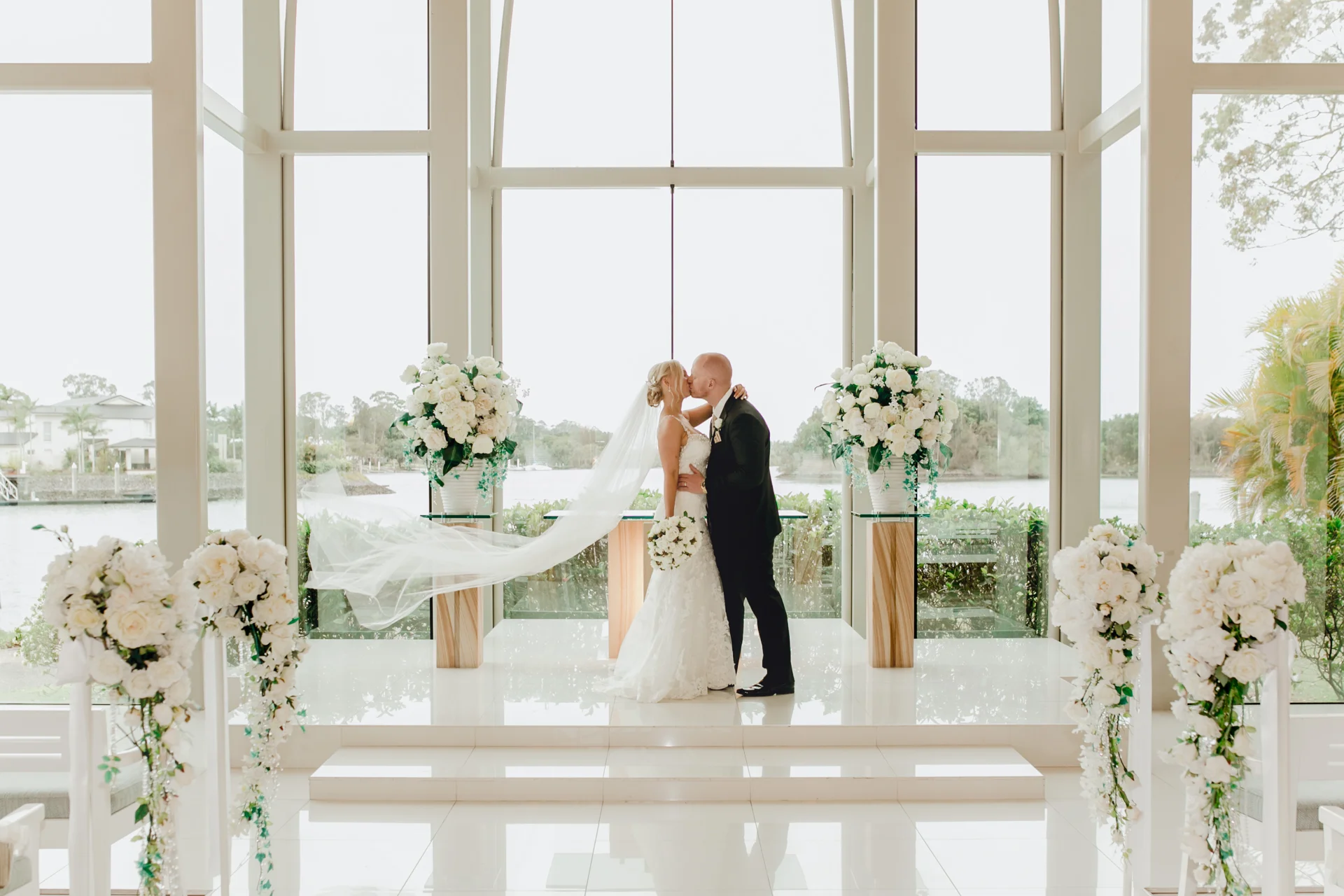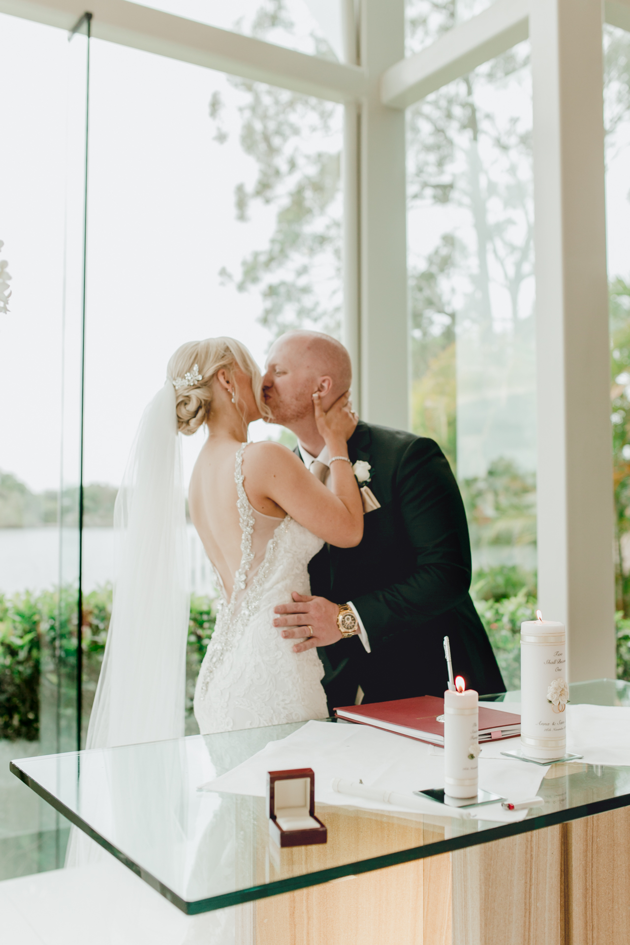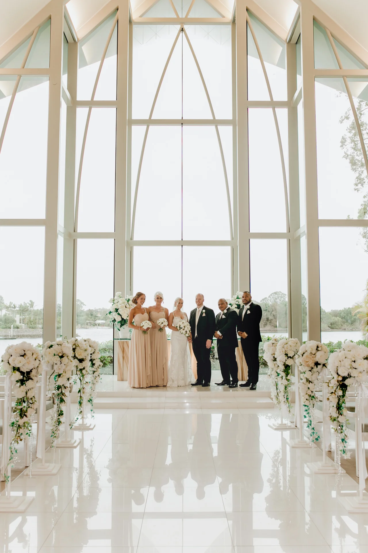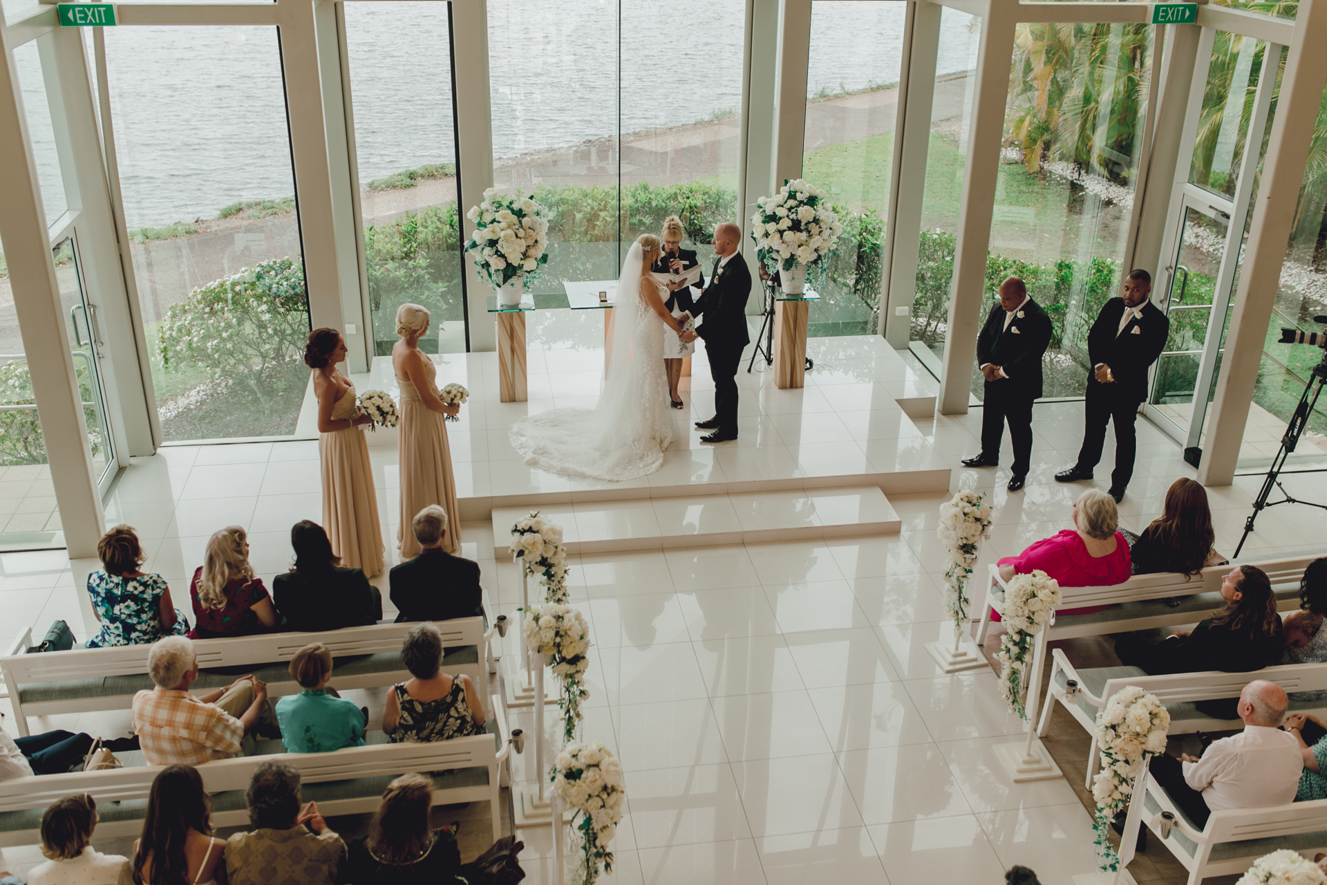 Heading over to the gorgeous & very popular sanctuary cove glass chapel featuring a tremendous floor-to-ceiling windows overlooking the Coomera River, and boasts a mezzanine floor for unique wedding videography & photography opportunities. I arrived to see Sam pacing nervously as the groomsman where trying to keep things light with a few jokes. The bridesmaids arrived & then Anna followed, it was a great ceremony with one of our favourite celebrants Tanya Bennett from I Do For You guiding proceedings.