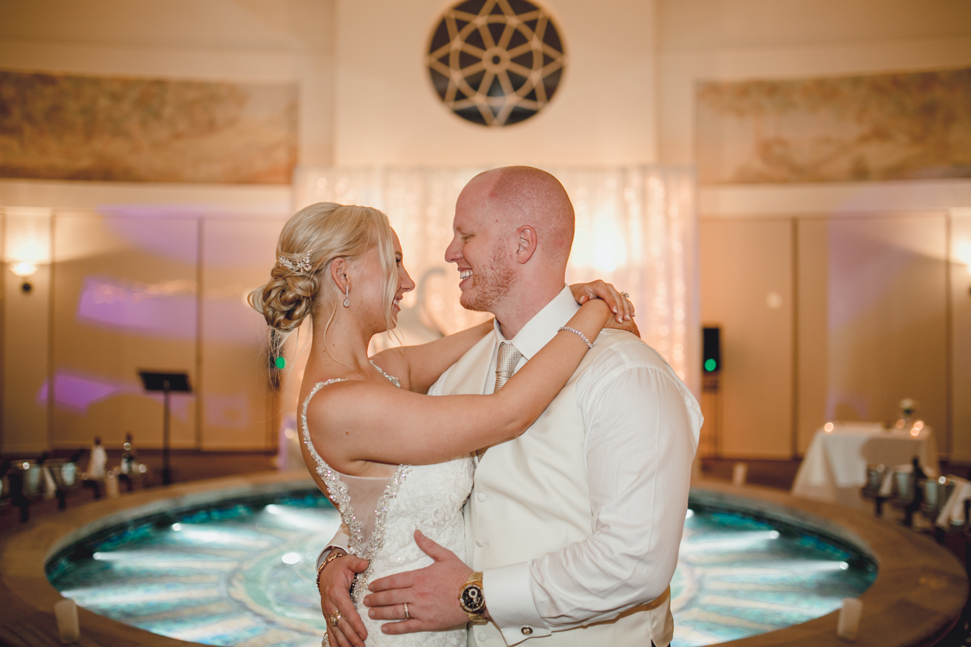 We walked in to the reception & were blown away by how truly elegant the venue looked with a featured ice sculpture featuring a fountain in the middle of the room. Our bridal party made a grand entrance with dry ice being poured into the fountain which made it even more spectacular.
