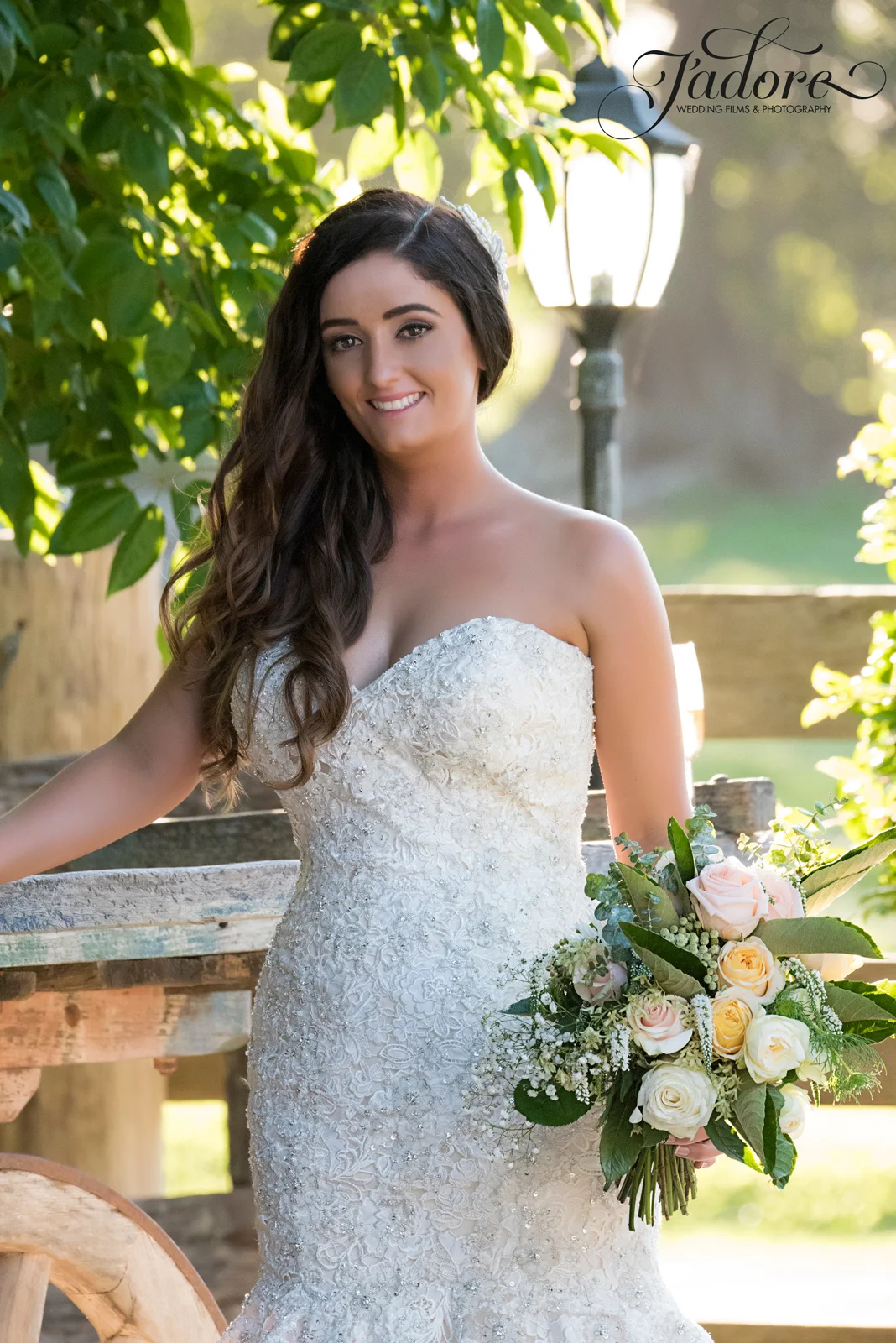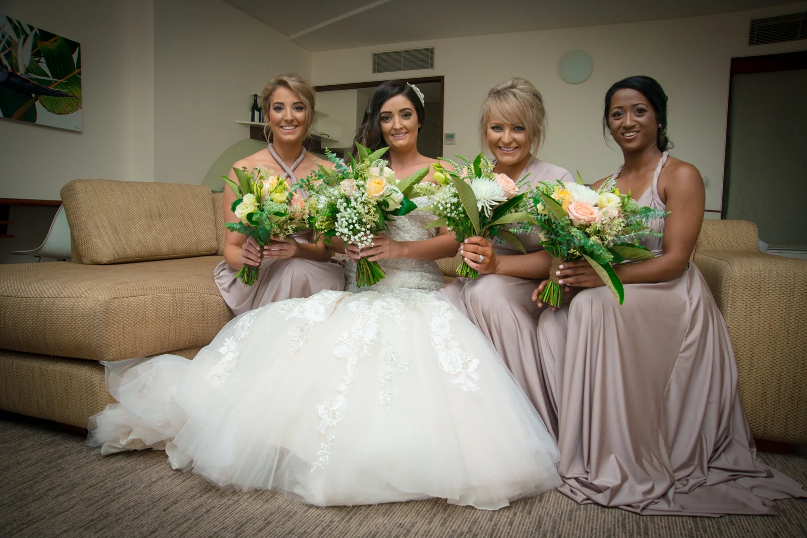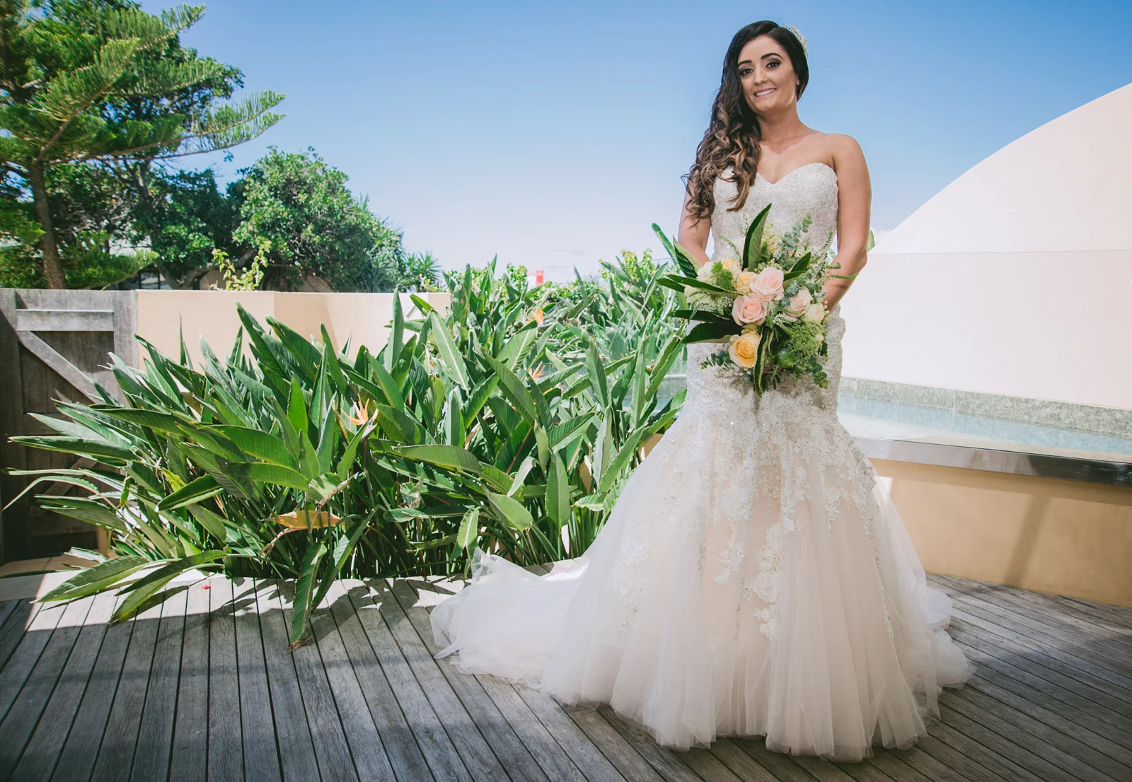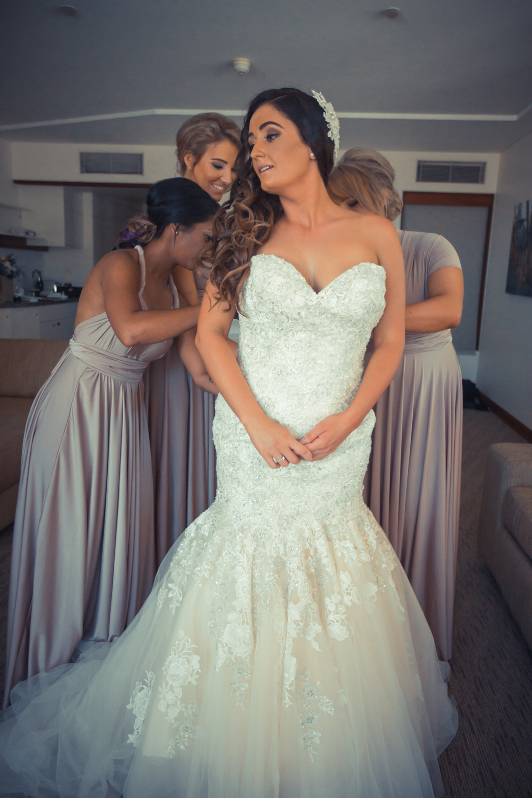 Walking into the stylish boutique studio, our latest bride Jodie was wearing a mermaid style themed gown which complimented the jewel encrusted embroidery on the bodice of her exquisite dress. This was complemented perfectly with her brown hair down in soft curls, and there was no denying that Jodie, looked beautiful. . The smiles of her and her brides maids filled the air, as her prepossessing smile brightened up the Byron bay hotel. accentuating Jodie's Bridal theme, the bouquet was strewn with pale pink and cream roses.