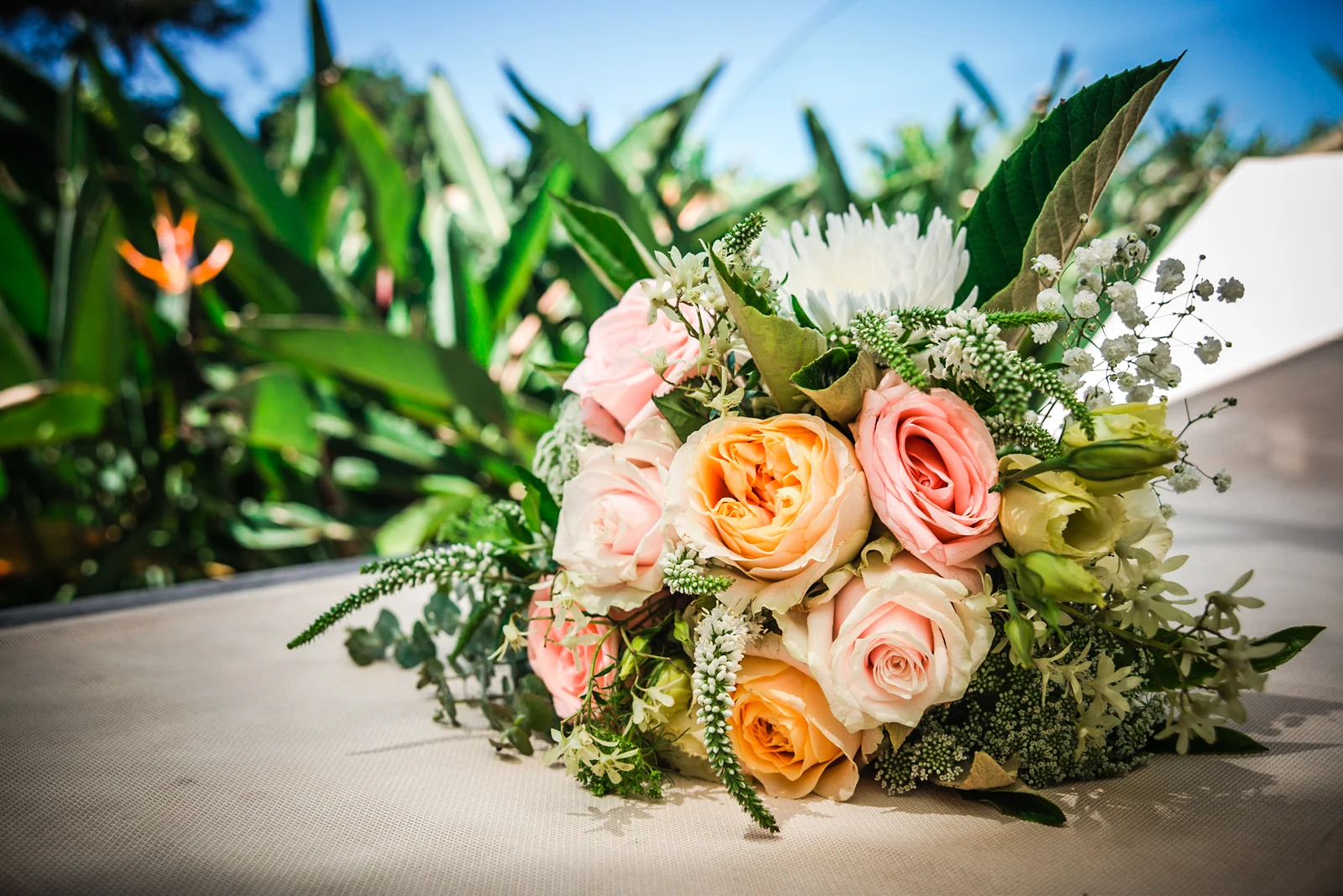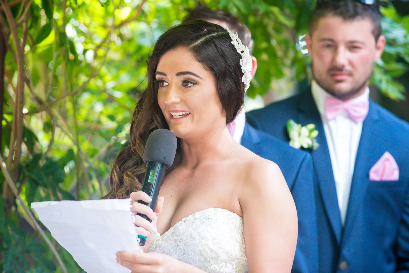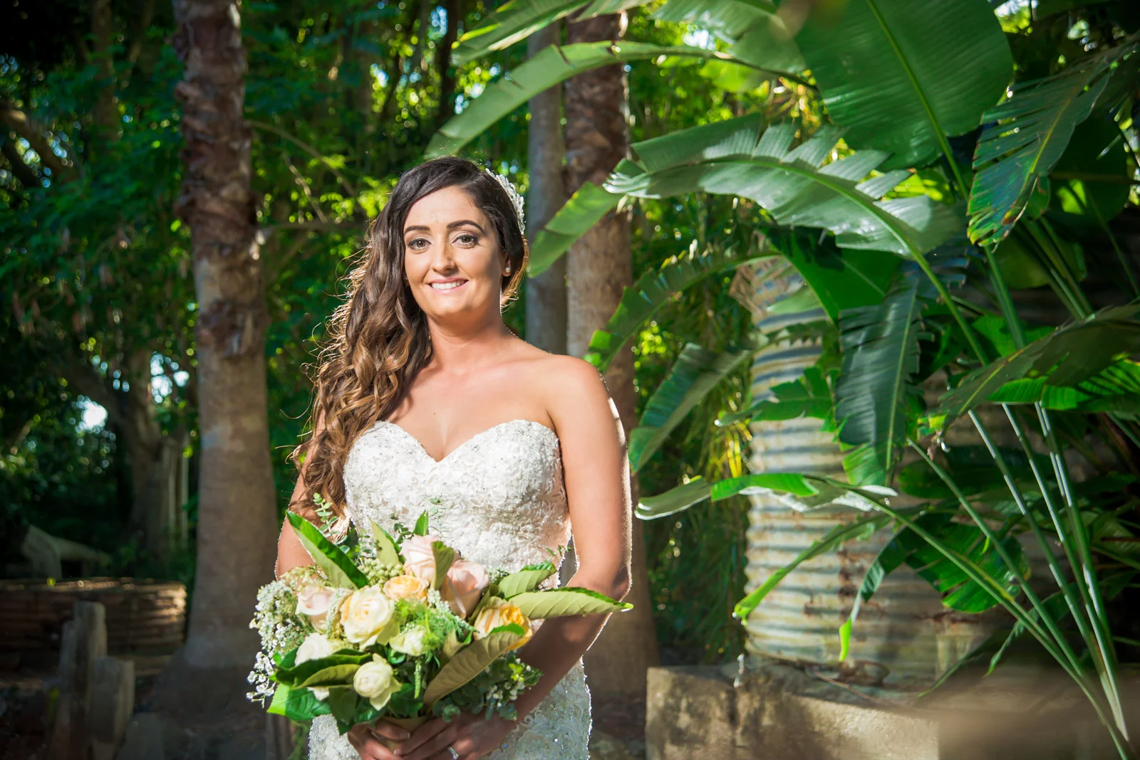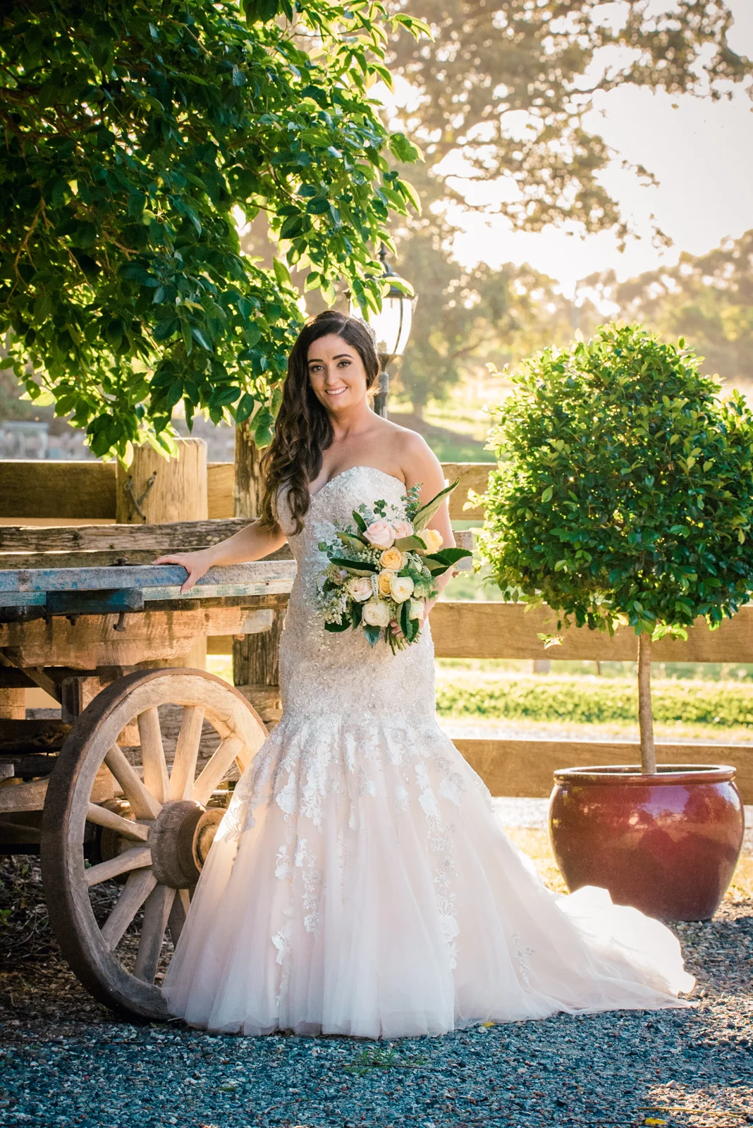 Walking into the stylish boutique studio, our latest bride Jodie was wearing a mermaid style themed gown which complimented the jewel encrusted embroidery on the bodice of her exquisite dress. This was complemented perfectly with her brown hair down in soft curls, and there was no denying that Jodie, looked beautiful. . The smiles of her and her brides maids filled the air, as her prepossessing smile brightened up the Byron bay hotel. accentuating Jodie's Bridal theme, the bouquet was strewn with pale pink and cream roses.