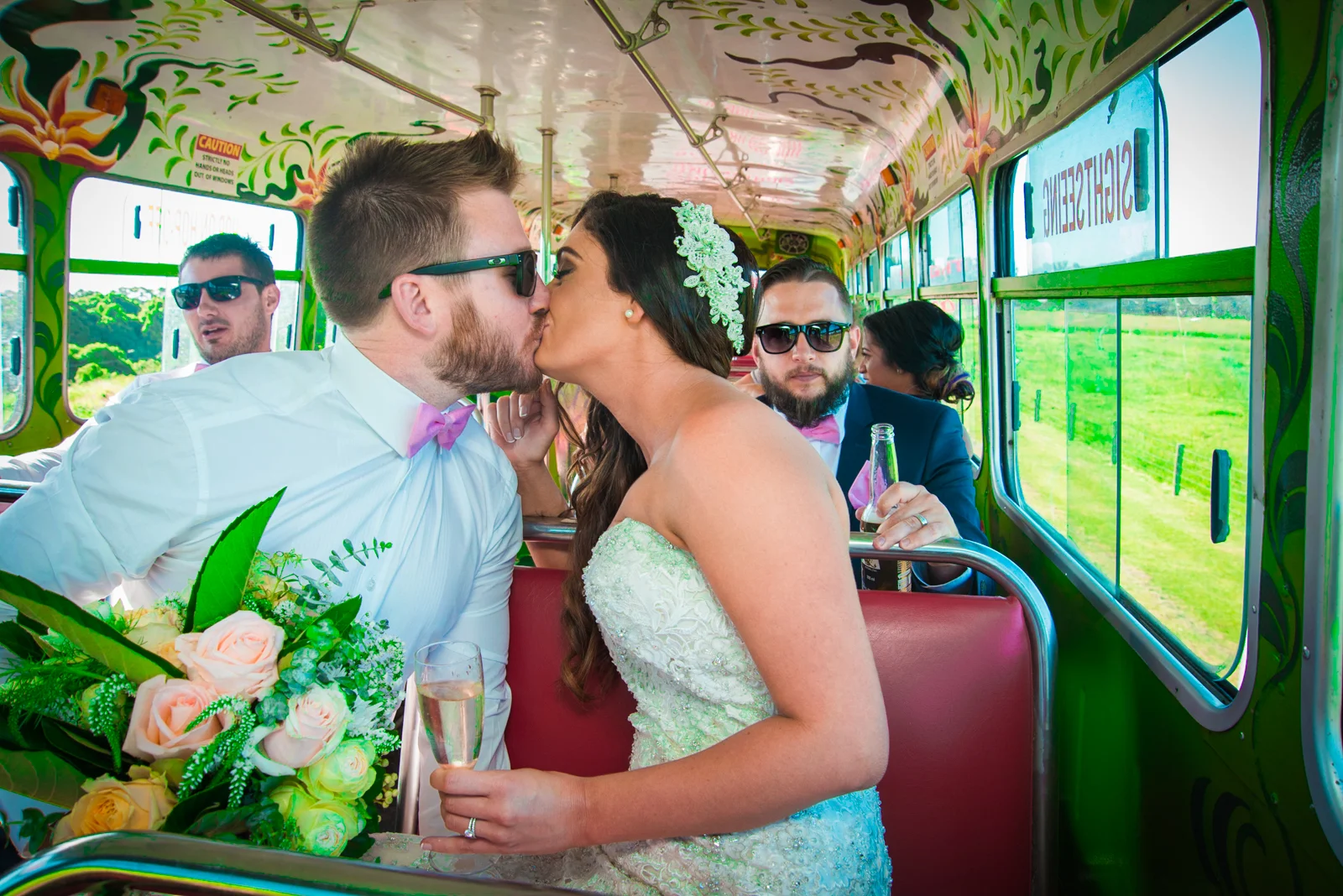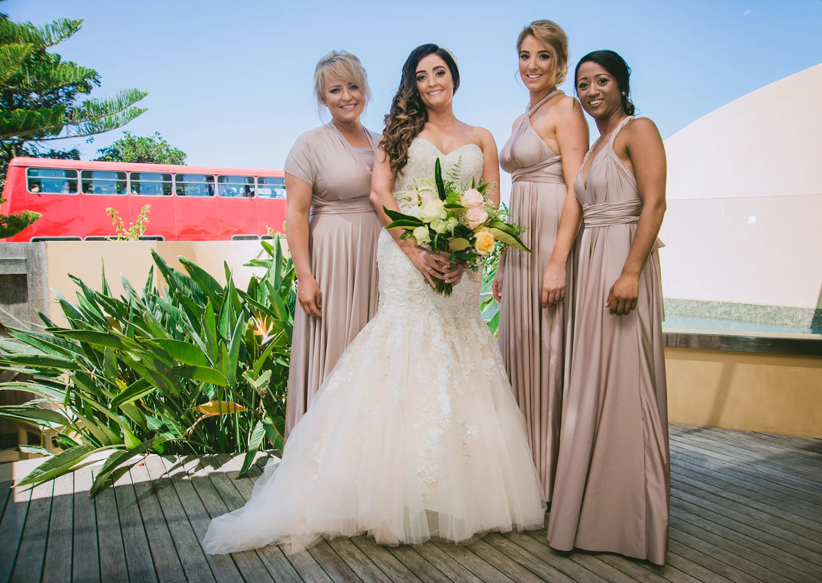 Just as we were getting the last of our shots with the oceanic backdrop before the Jodie went off in her stretch hummer; two tourist double decker buses pulled up right out the front. Courtesy of The Magic Bus Company, the stylish bus didn't disappoint as the guest bus was filled with hoots and laughter as the guests tried to capture a glimpse of Jodie before they continued on to the ceremony.