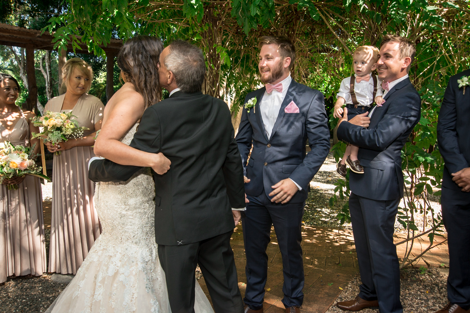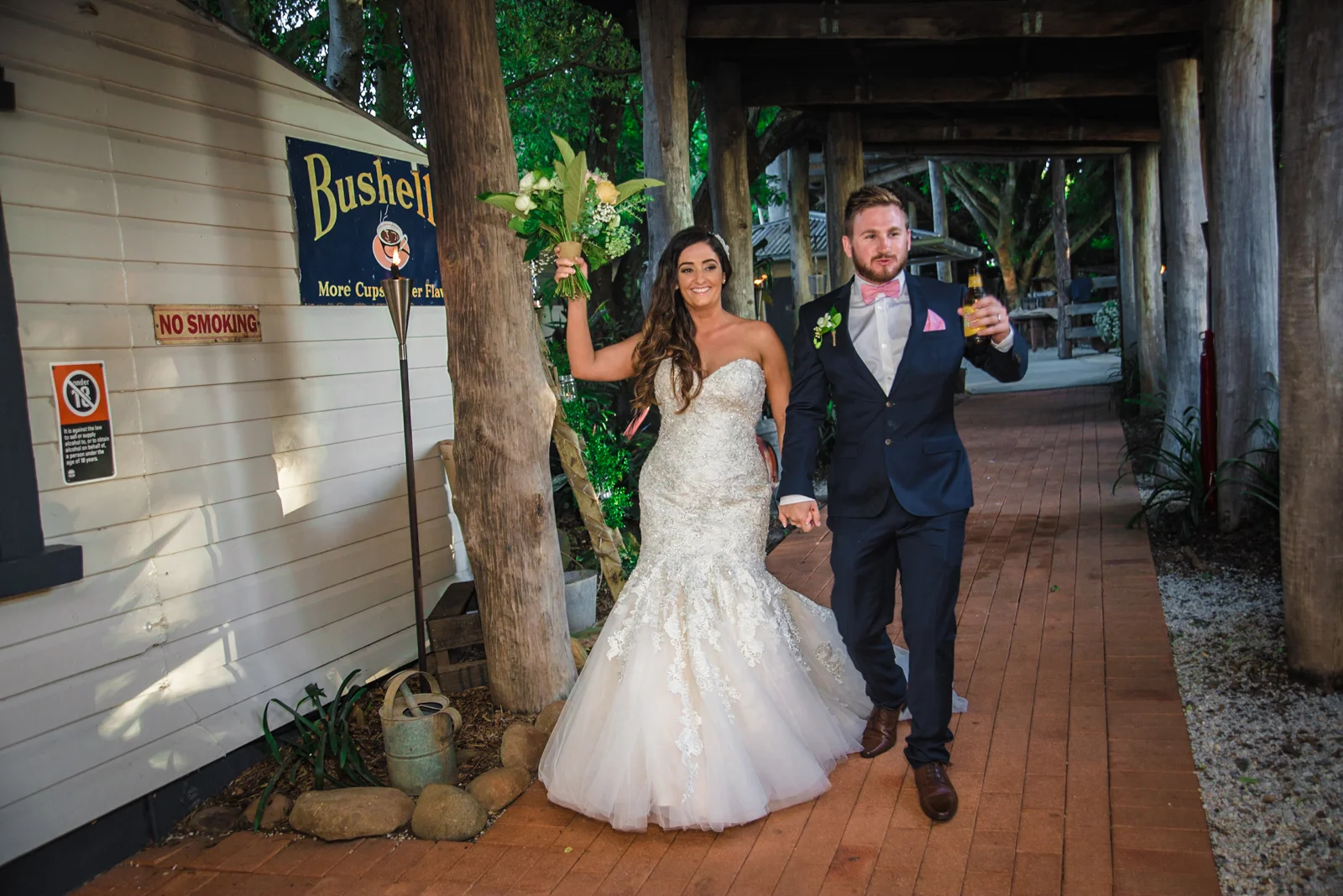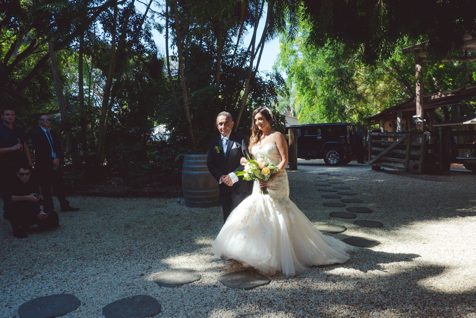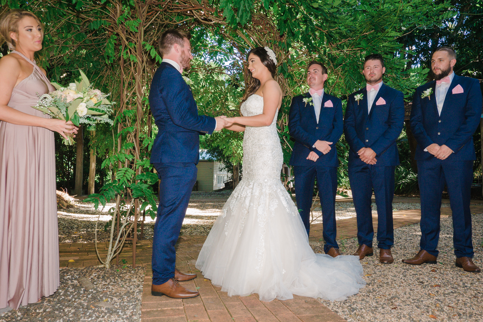 The ceremony was held an hour away in the hinterlands away from Byron bay, we continued our journey to the rustic themed venue called Down Convery's lane. The wedding venue provided the perfect rustic theme as the 5 acred place surrounds itself with lush rainforests and 100 year old fig trees. As everything was out in the open under the tree top canopies, this brought our everyone laid back nature as live music prepared the guests for the what was to happen next. Still nervous tension bubbled around, while Simon stood under the picturesque arch way.
