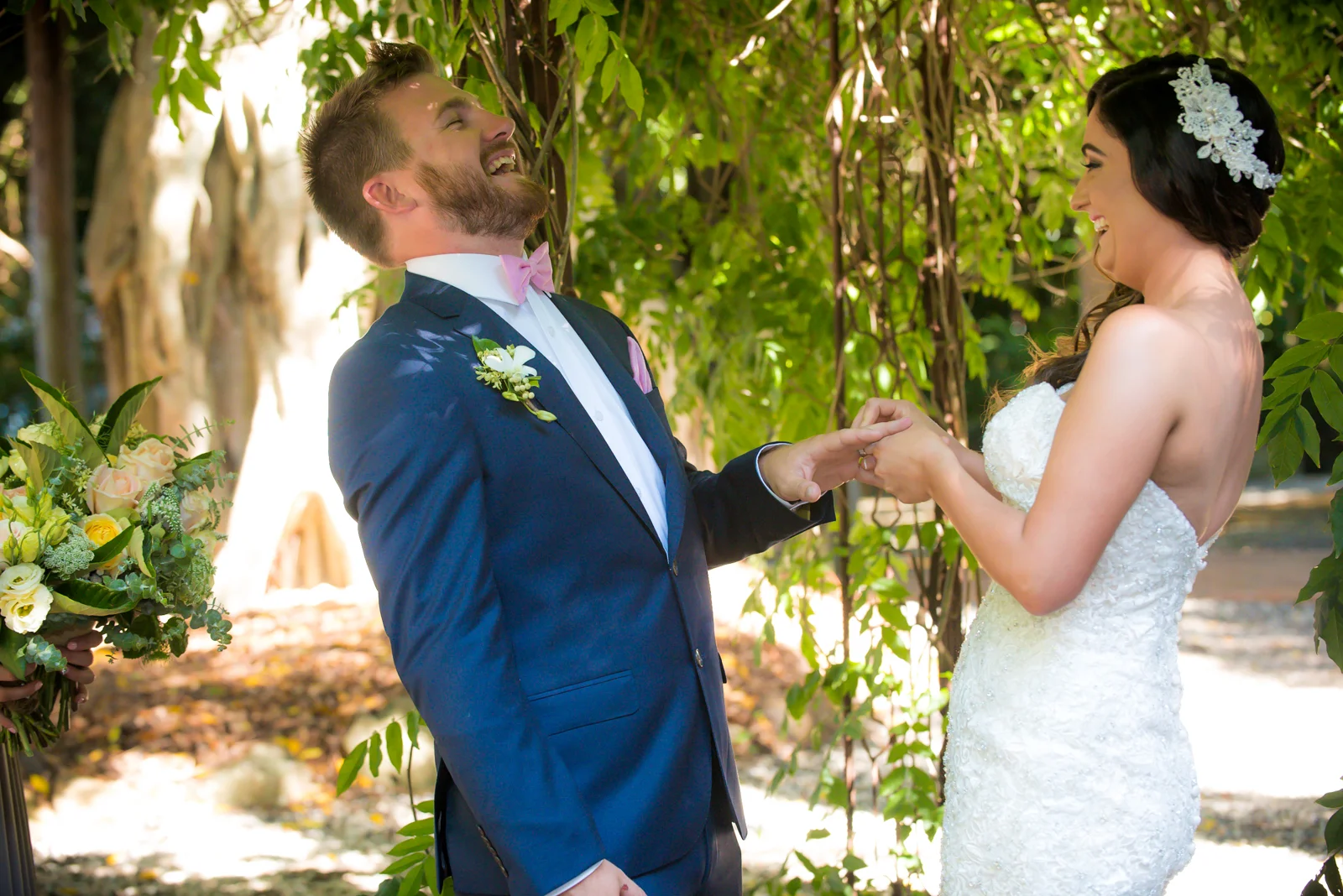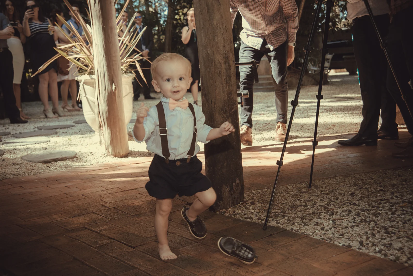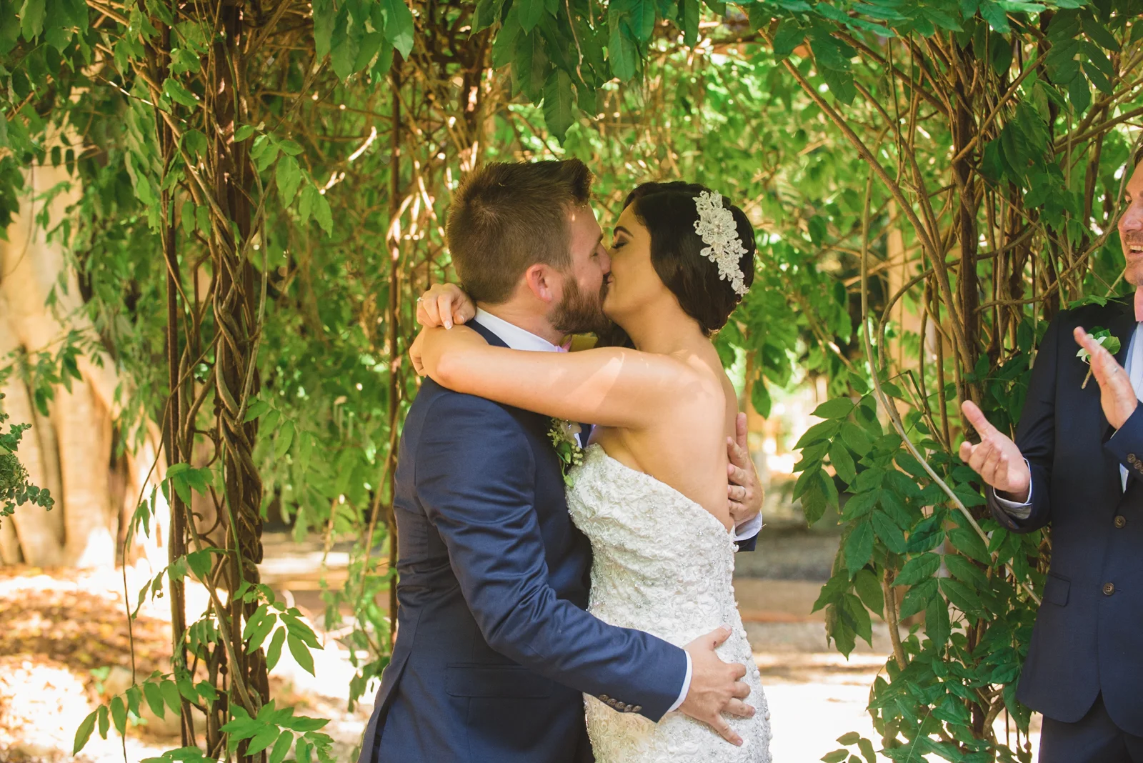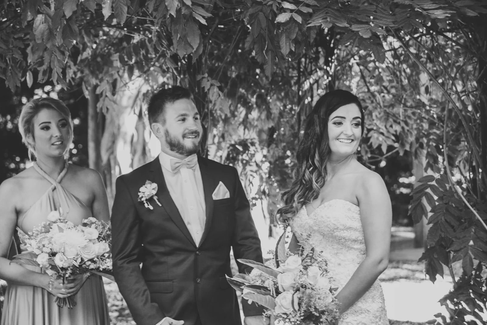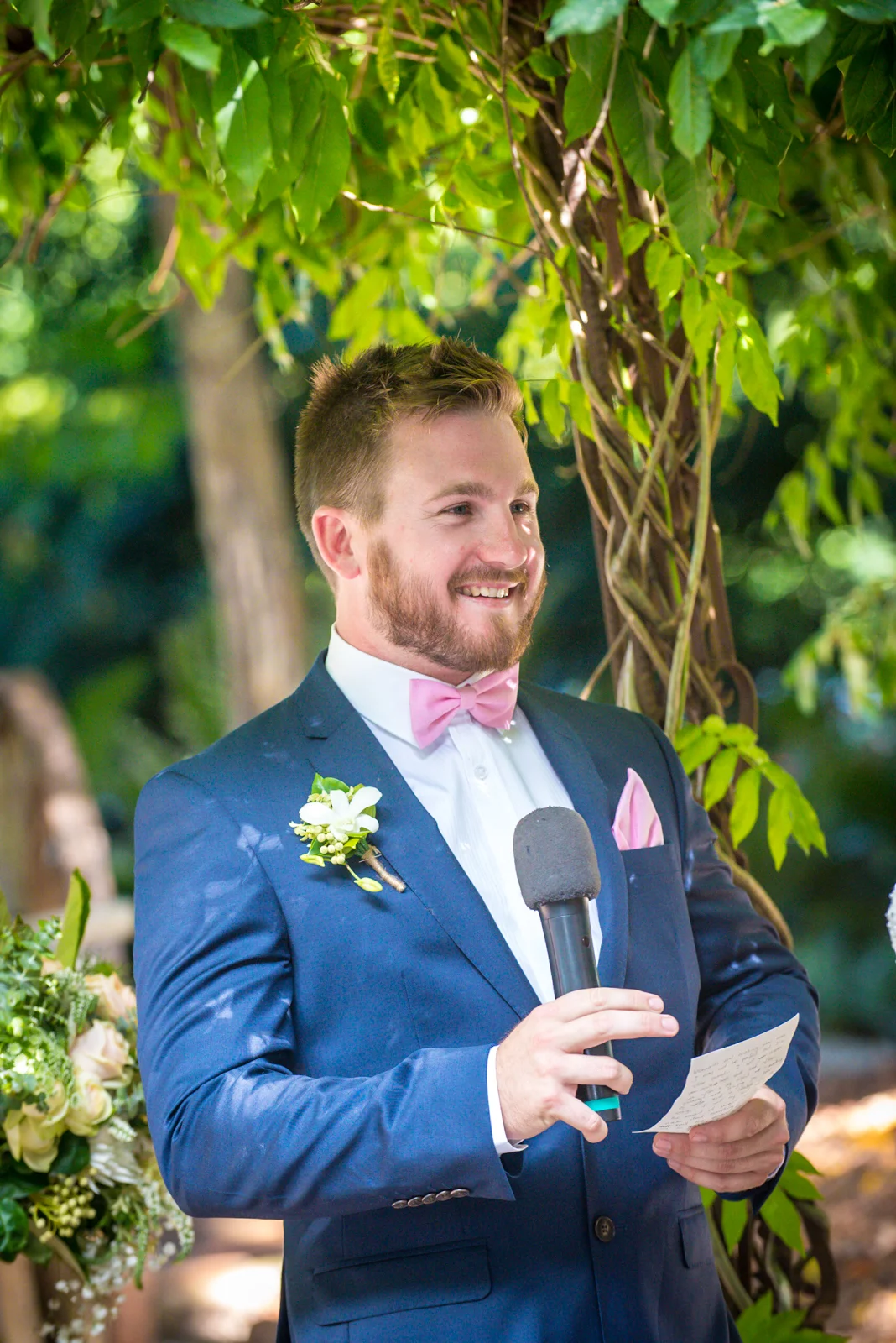 The ceremony was held an hour away in the hinterlands away from Byron bay, we continued our journey to the rustic themed venue called Down Convery's lane. The wedding venue provided the perfect rustic theme as the 5 acred place surrounds itself with lush rainforests and 100 year old fig trees. As everything was out in the open under the tree top canopies, this brought our everyone laid back nature as live music prepared the guests for the what was to happen next. Still nervous tension bubbled around, while Simon stood under the picturesque arch way.