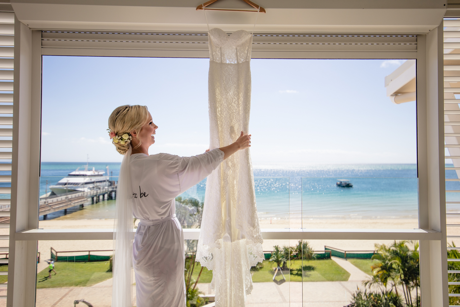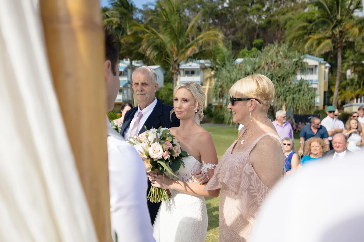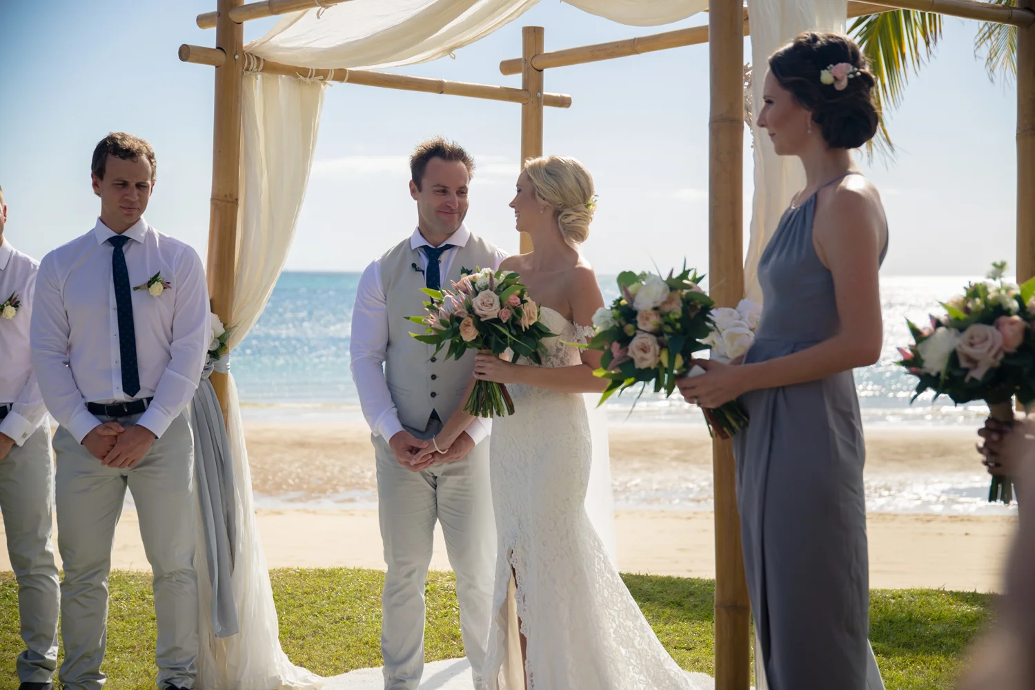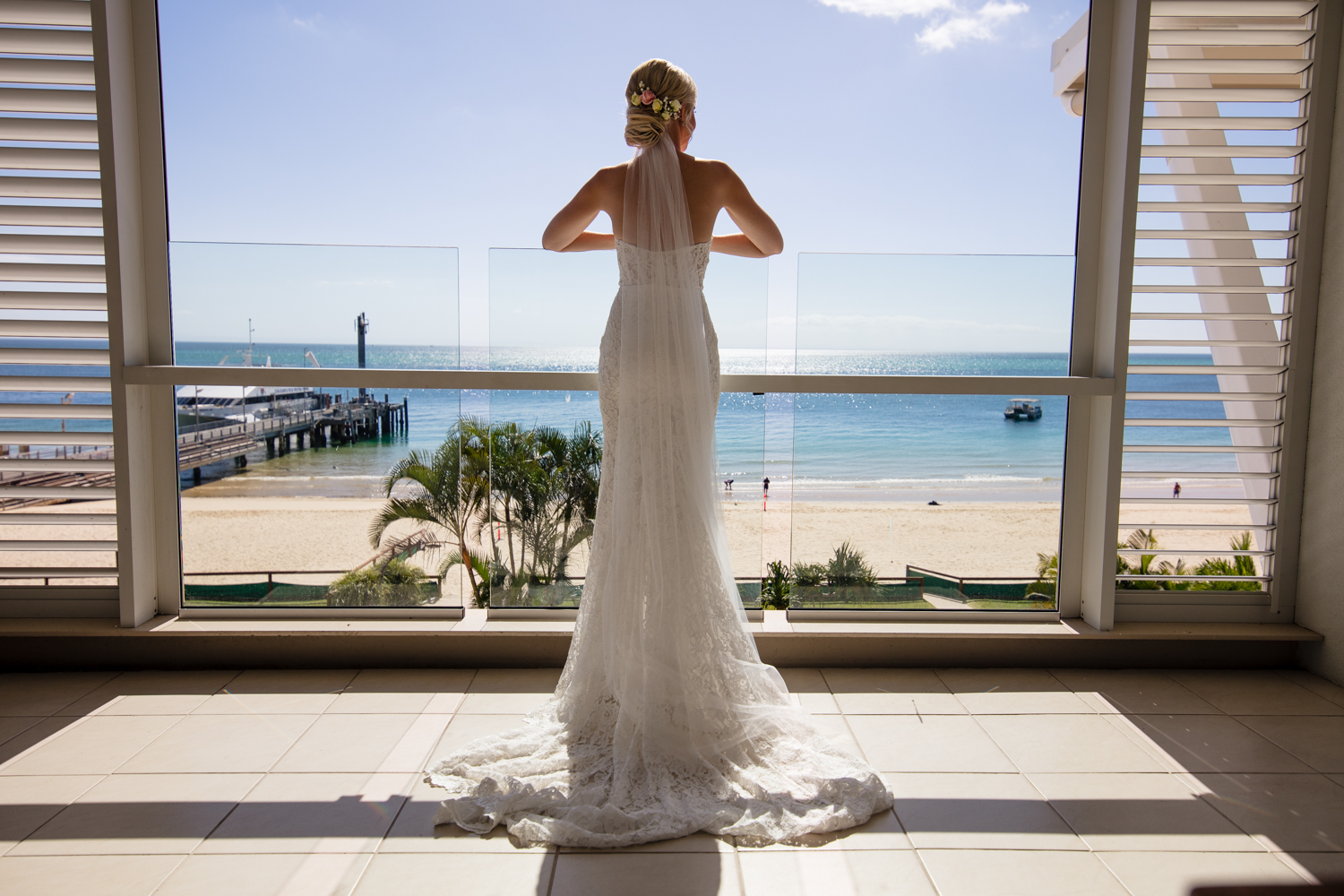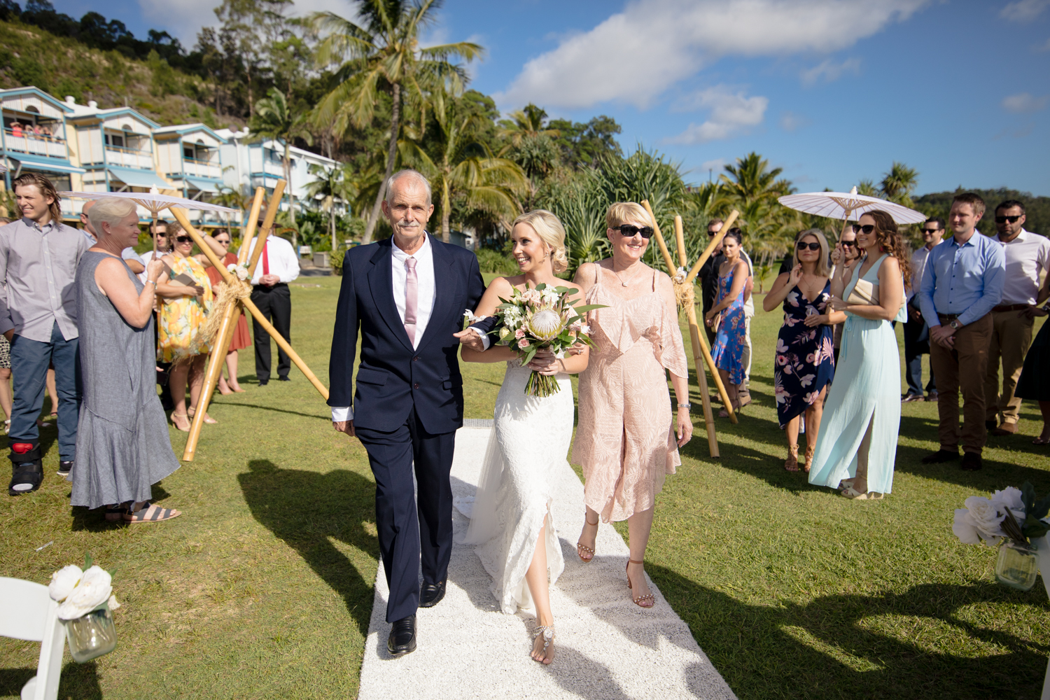 Moving onto Ella and the girls they were all super relaxed just cruising on through the morning which is lovely to see. Once Ella was ready thanks to Goldielocks Hairdressing for doing the amazing hair do & wearing her gorgeous gown designed by Made With Love Bridal we got some beautiful images out on the veranda before making our way to the ceremony location only 10 minutes down the Island. Ella's gorgeous flowers were probably some of my favourite, absolutely loved the floral design by Eden The Flower Shop.