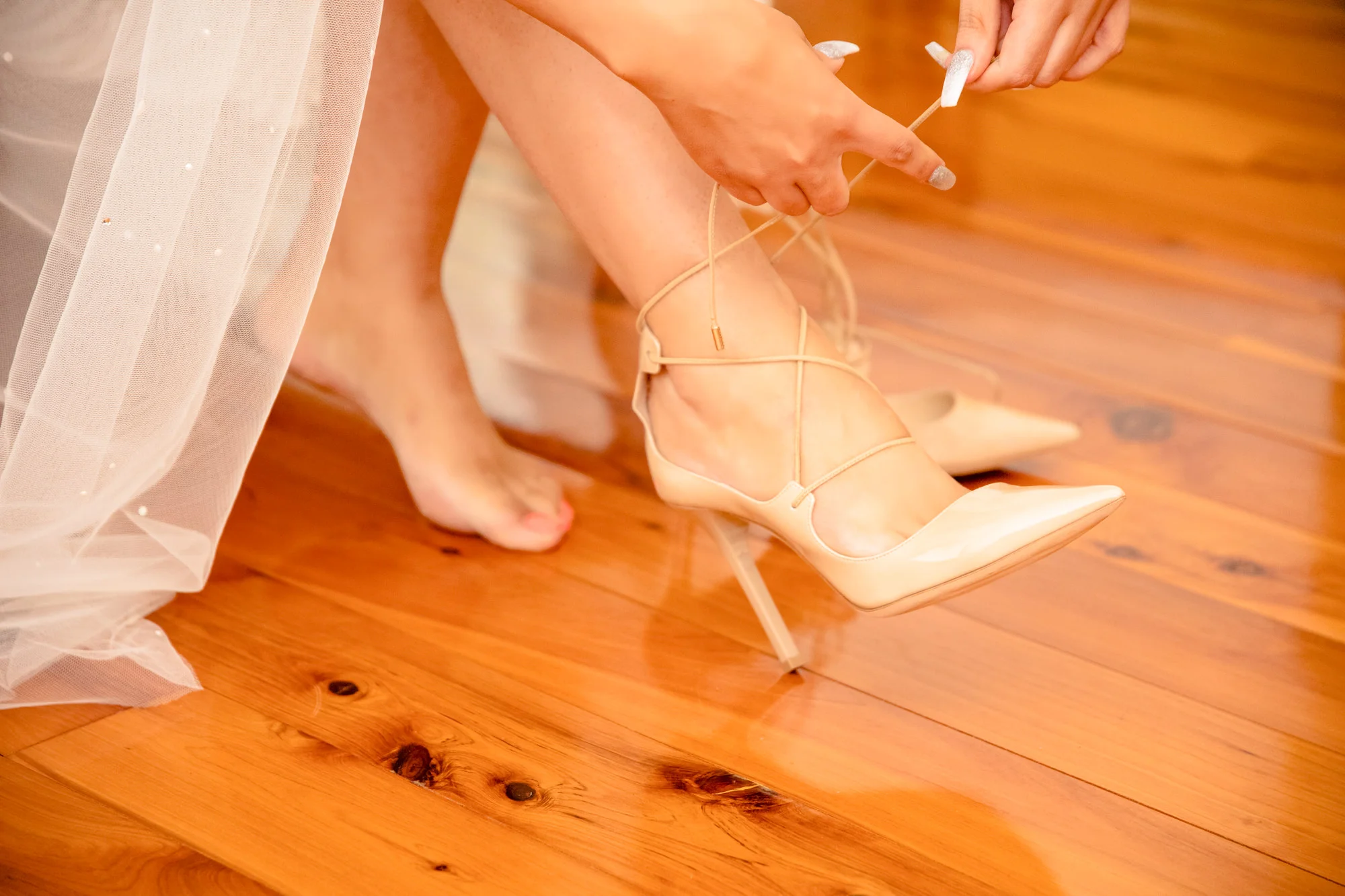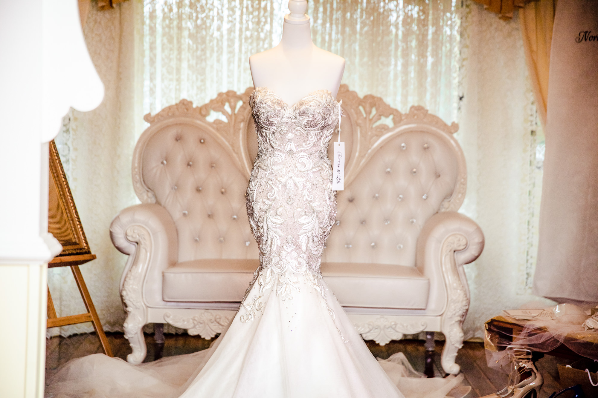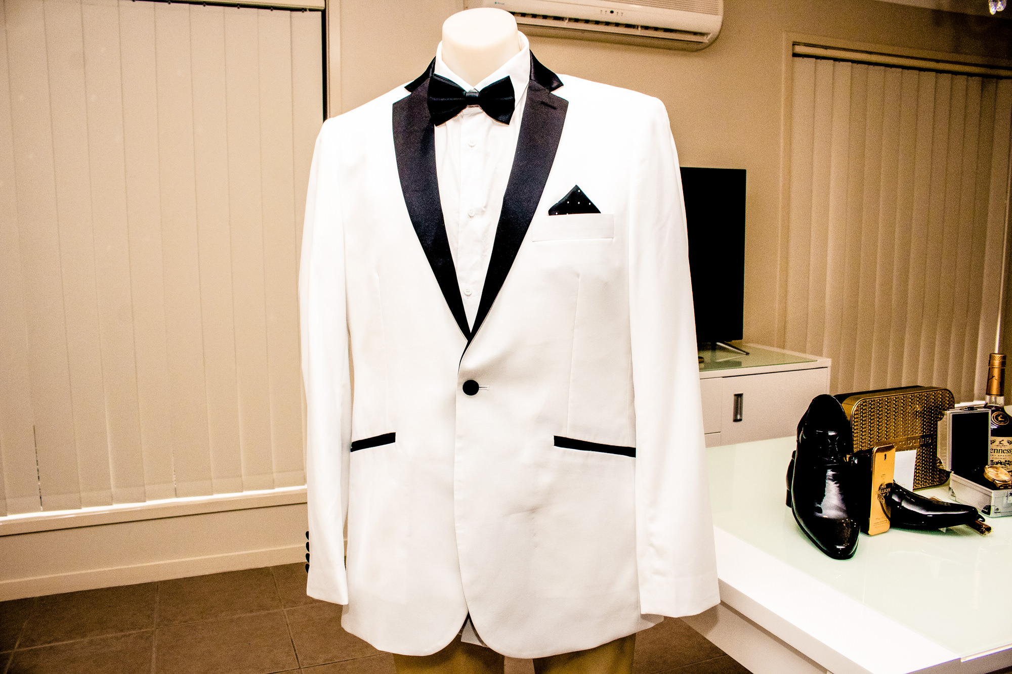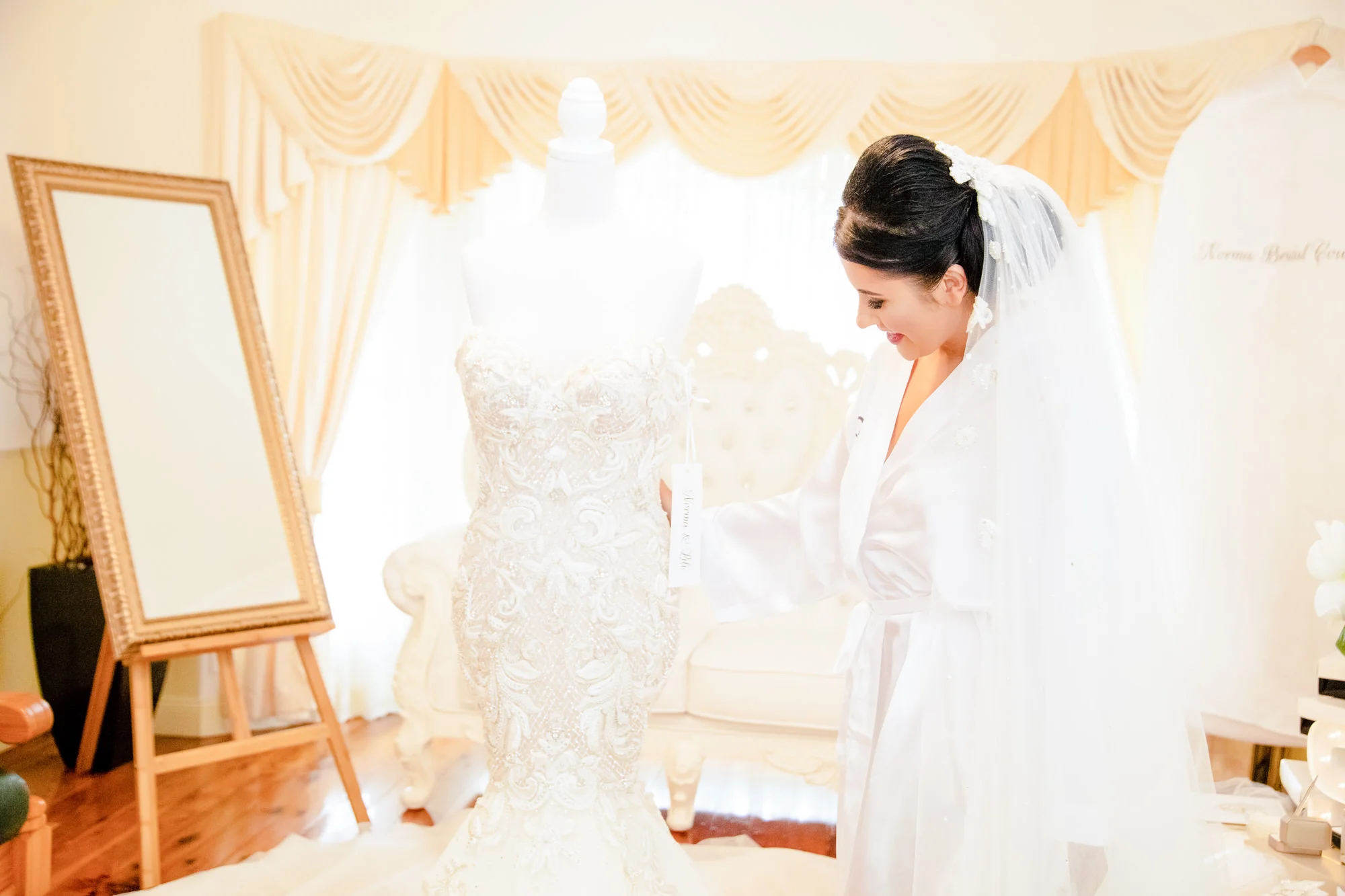 As we head into the the getting ready room, we realised everything was set up to perfection, there was a Mannequin sitting directly in the middle of the lit up room, where the beautiful strapless gown made in Sydney from Norma & Lili Bridal Couture, One Stop Wedding Shop Brendale, glittered from head to toe. The rest of the accessories was set up littered with candles around the table to give a warm glow and create a great atmosphere. Apart of the accessories was the two pairs of shoes, one cream for the ceremony, and one to party the night away in blue form, Sabrina had everything picked out to perfection. After getting the must shots, we quickly got all the girls in for a few bridal photos/video with champagne popping before it was time for the girls to start getting ready in the black gowns.
