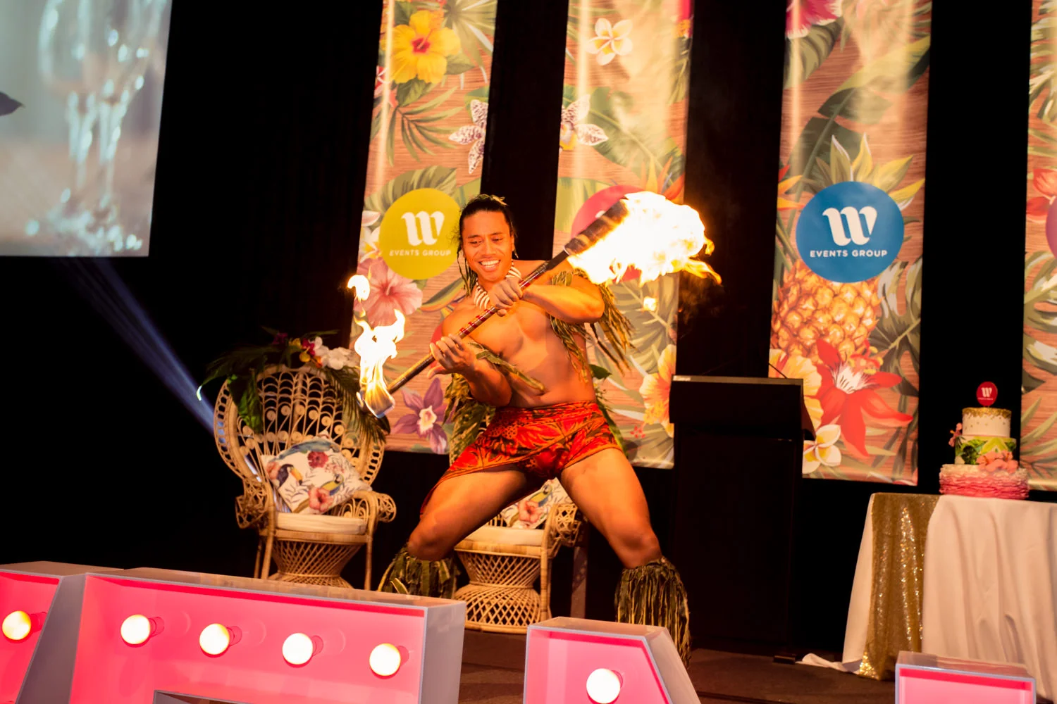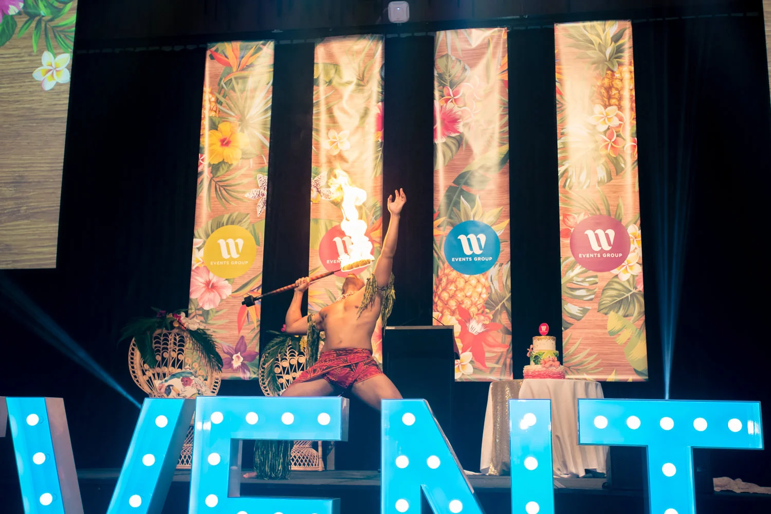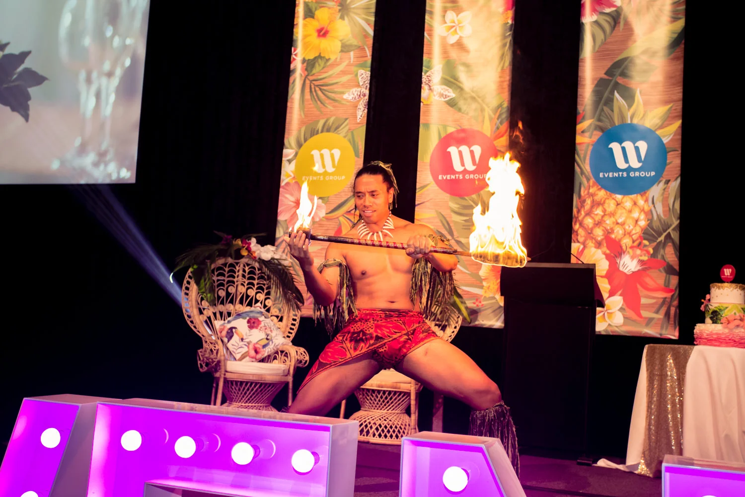 Following this we had a brilliant fire twirler accompanied by some Fijian style dancers from Heilani Polynesian School of Arts, having a few of the guests get involved they had a blast. Not long after this it was time to light the candles on the cake, whom were supplied by AV Partners, which by the way did a GREATjob!!. After the second one was lit there was an AMAZING sparkler show coming from the three huge stands behind the desert table which I am certain everyone was impressed by, I know we sure were.