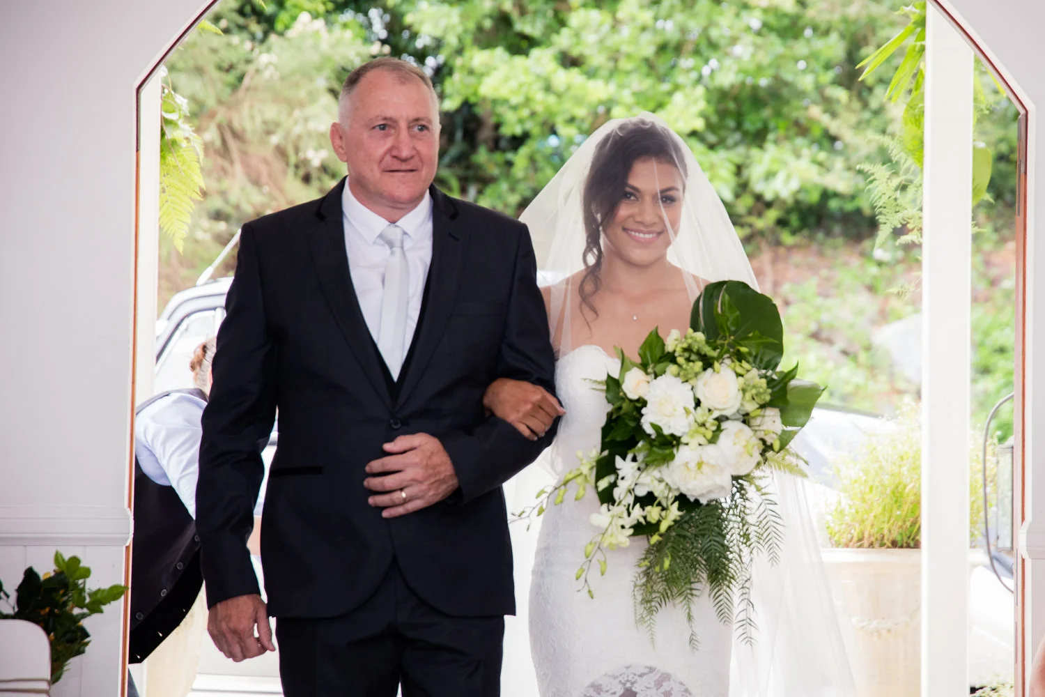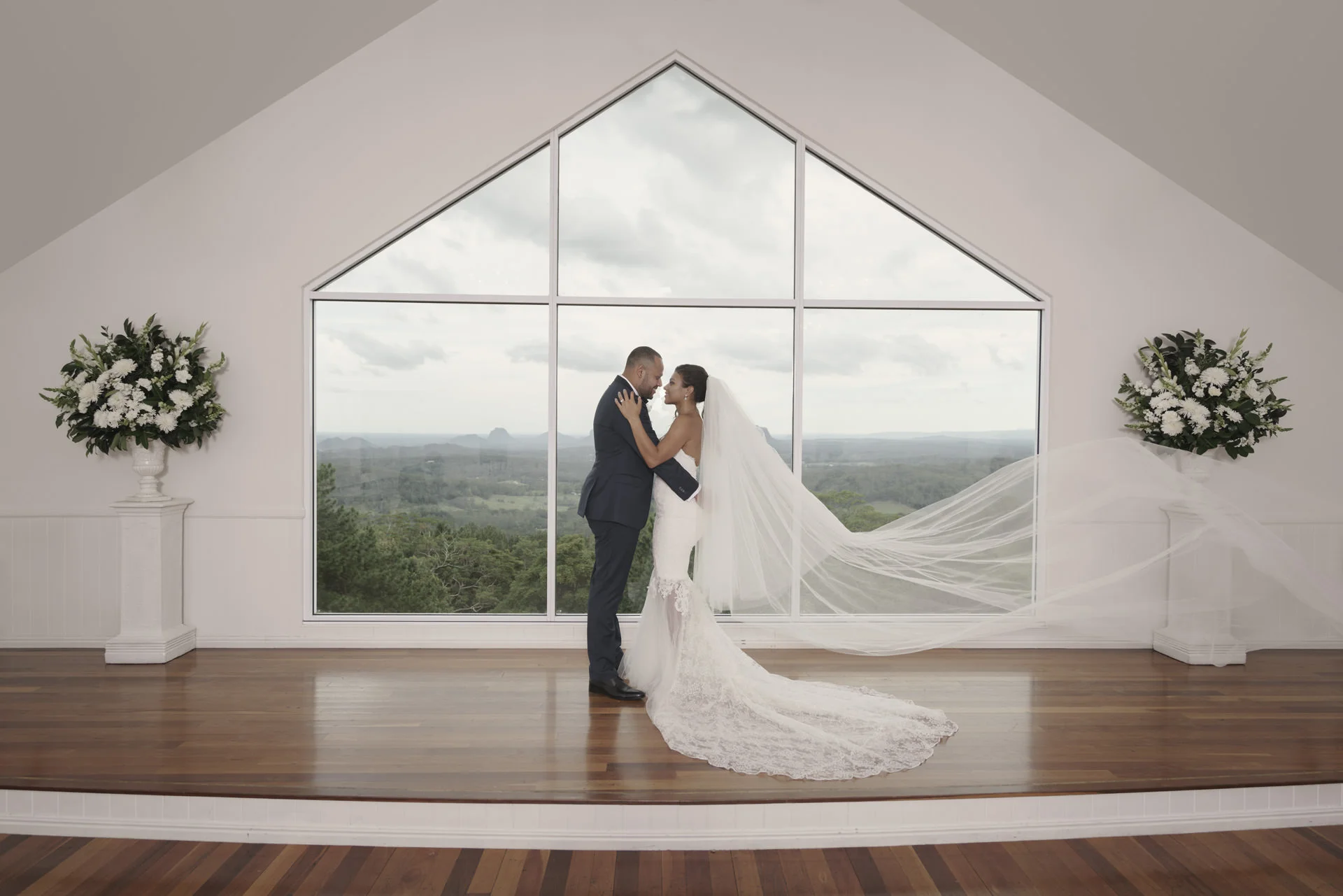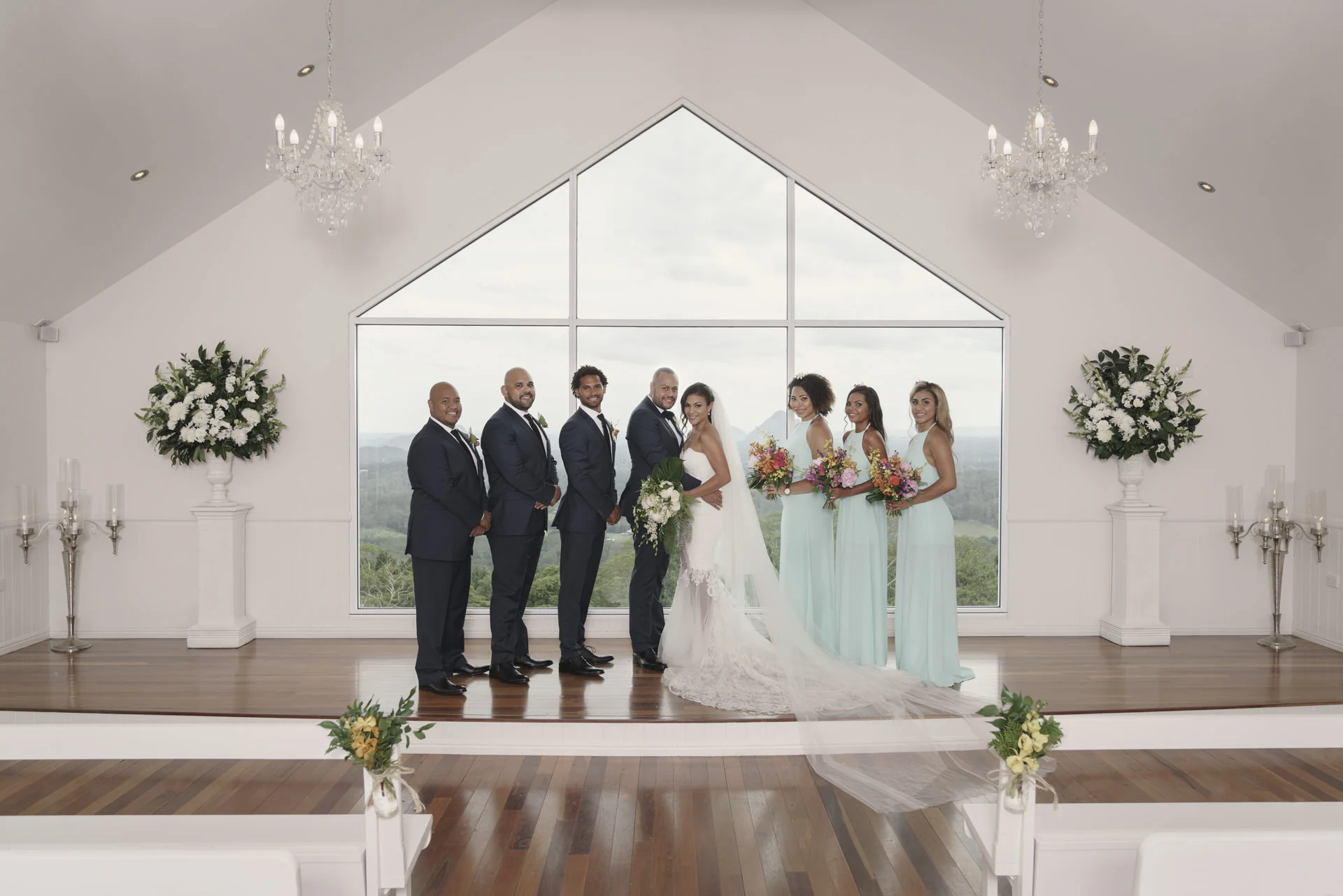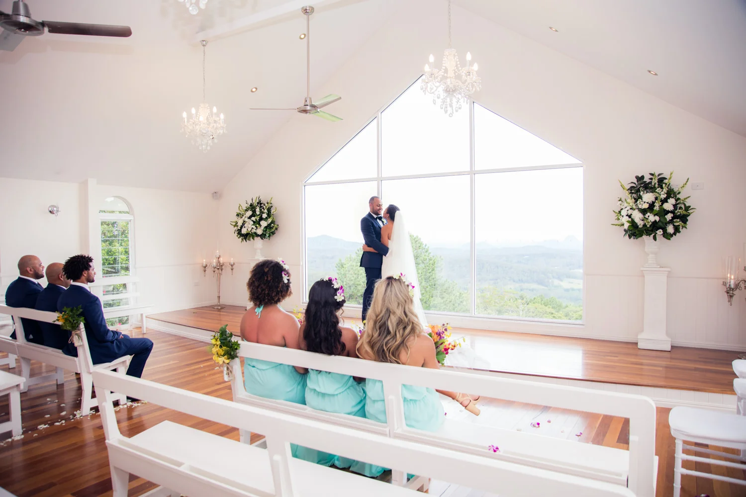 As we got to Wedding at Tiffanies in Maleny we were excited to be able to shoot a chapel ceremony. Tiffany’s Chapel offers you & your guests an unsurpassed, sweeping view to the magnificent Glasshouse Mountains & beyond to Brisbane & Moreton Island. Tiffany’s Chapel has been exquisitely & elegantly decorated in neutral tones with antique pews, chandeliers & polished hardwood timber flooring. Tiffany’s Chapel can seat 120 of your closest friends & family members in air conditioned comfort. We were right, As soon as Janina walked through those doors, we were sure to see Steven's heart stop, if only just for a moment. We love doing our job alone just to see these beautiful key moments in peoples lives.