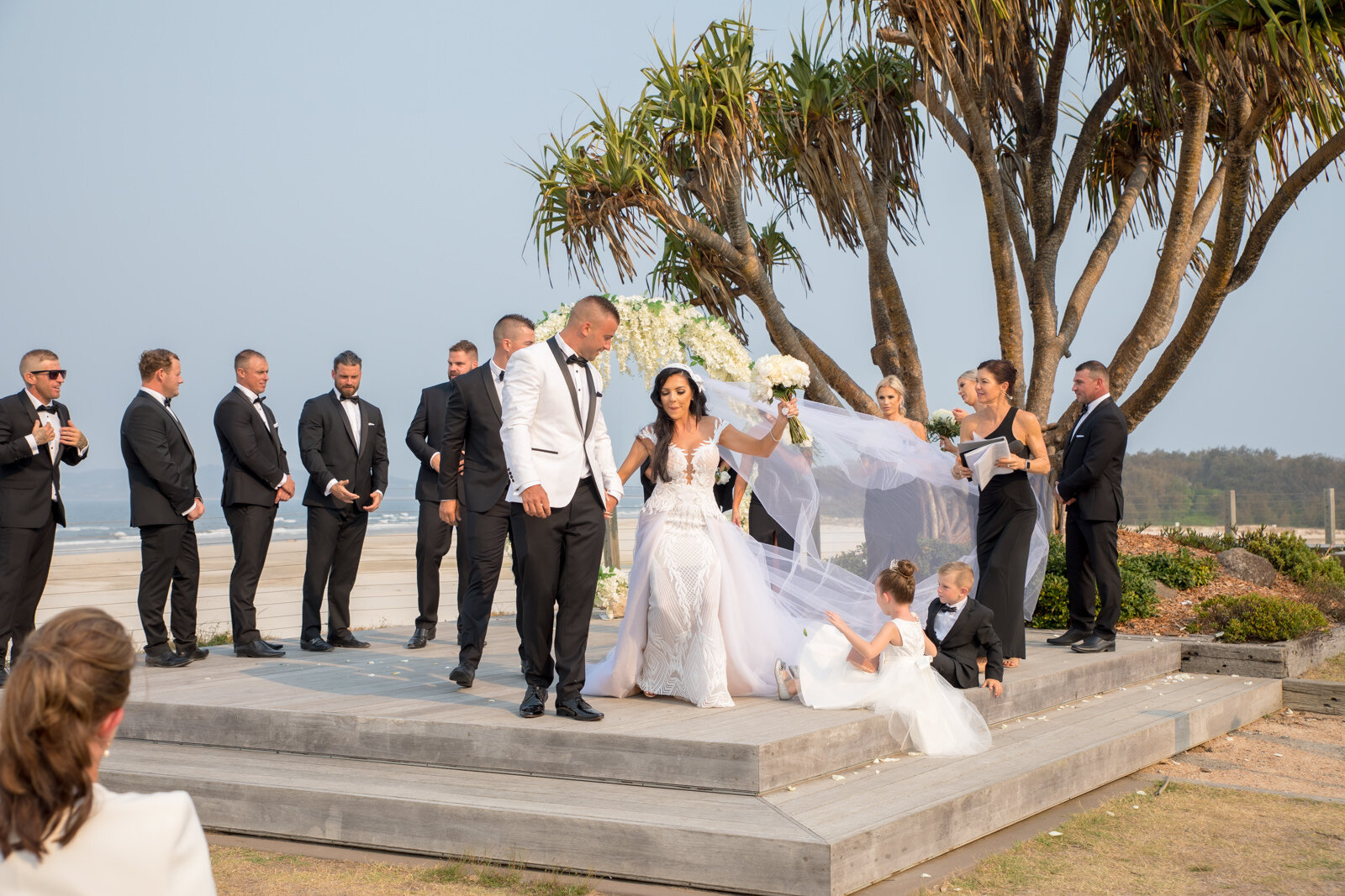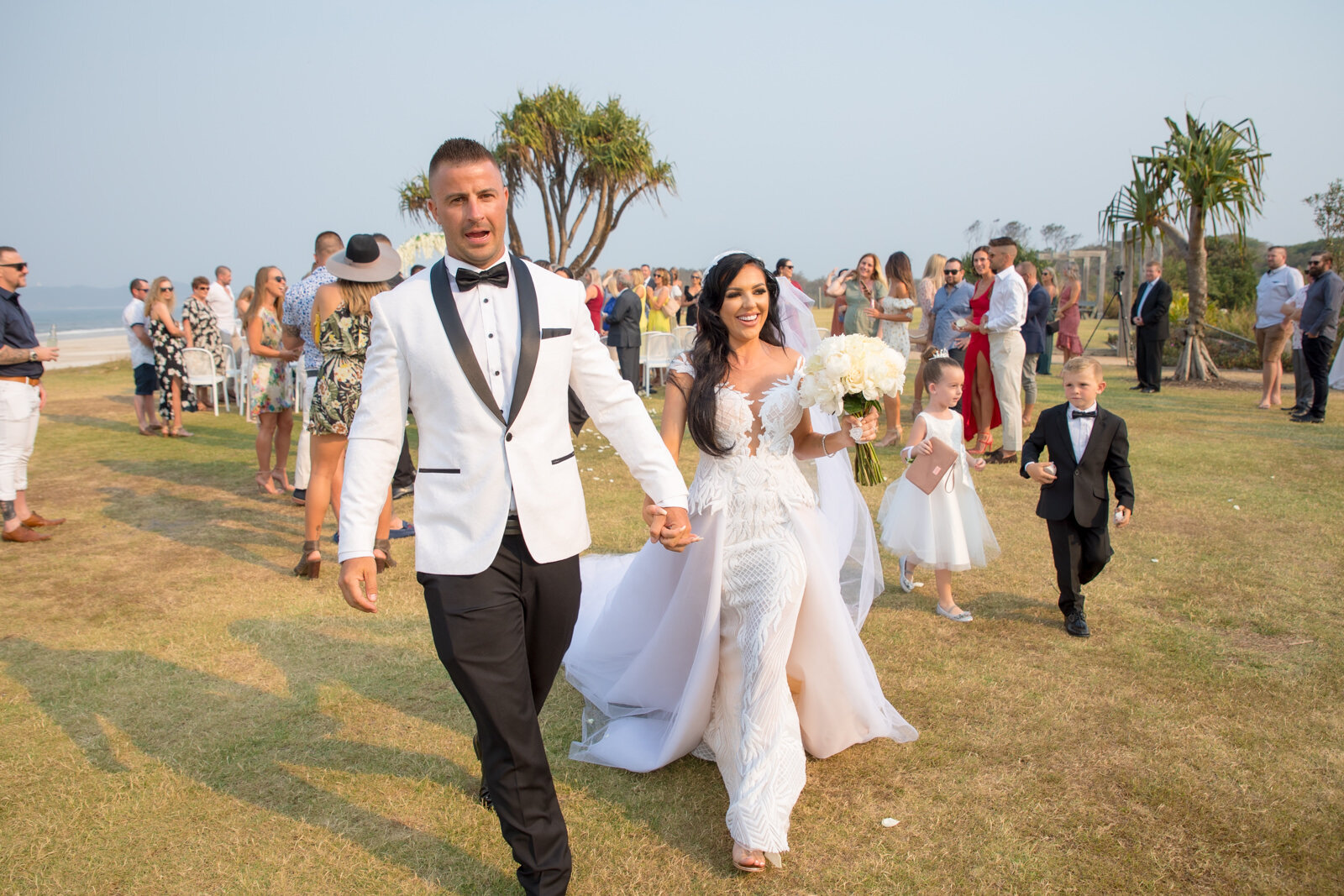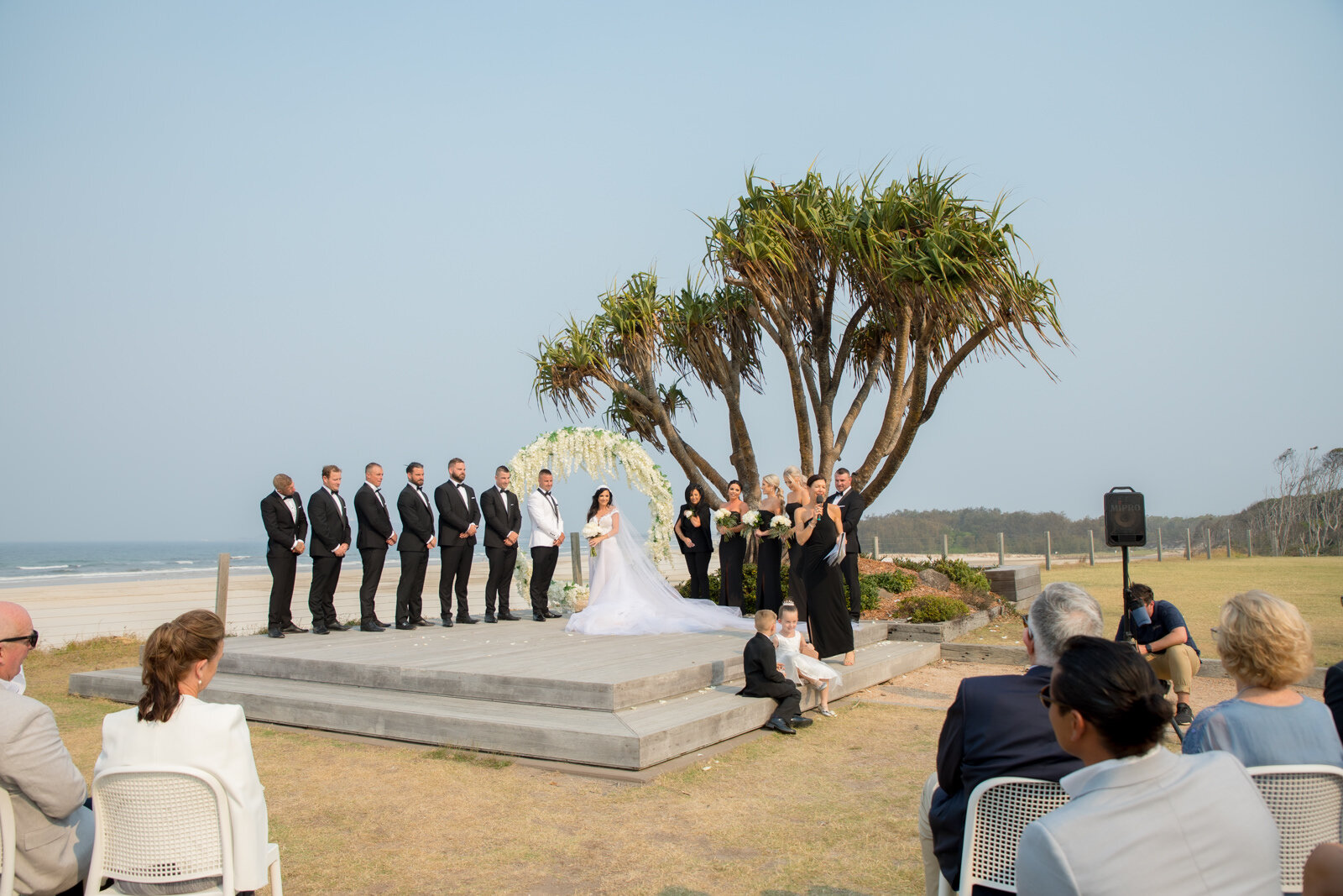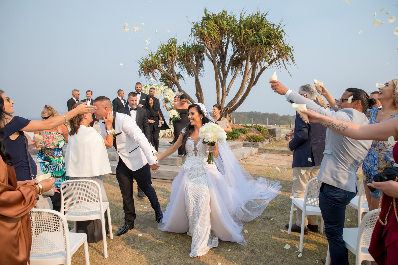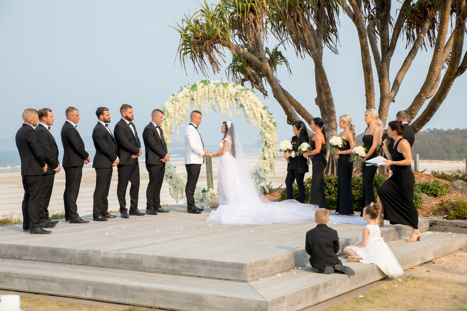 With gorgeous ocean views, the ceremony was in an epic location. Guests starting to arrive you could definitely feel the love everyone had for Ben and Brittni-Lea. The ceremony was short and sweet, straight to the point and exactly what it was always meant to be, perfect. If you are looking for an absolute beachfront Ceremony Location, the ceremony area at Elements of Byron will not disappoint. The French Petal also added that finishing touch to the area, creating a jaw-dropping circle arbour for Ben and Brittni-Lea to stand before as they said their vowels.